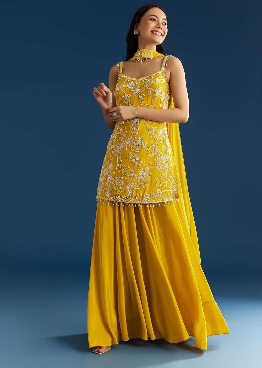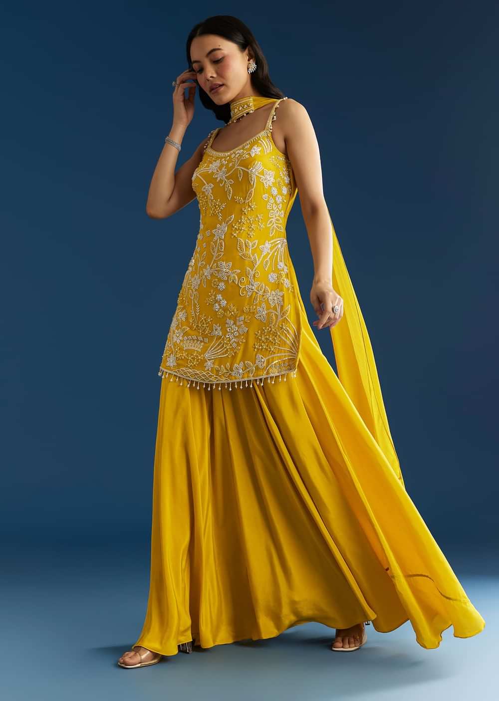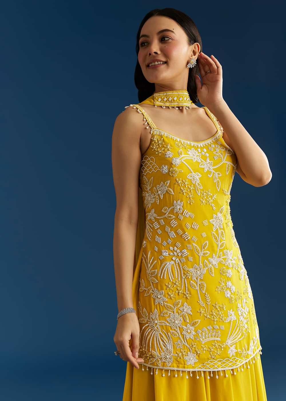 A vibrant yellow chinon kurta set adorned with moti, sequins, and cut dana work, paired with a contemporary choker-style dupatta. Perfect for haldi festivities with a glam twist.Standard length for... More Product Details