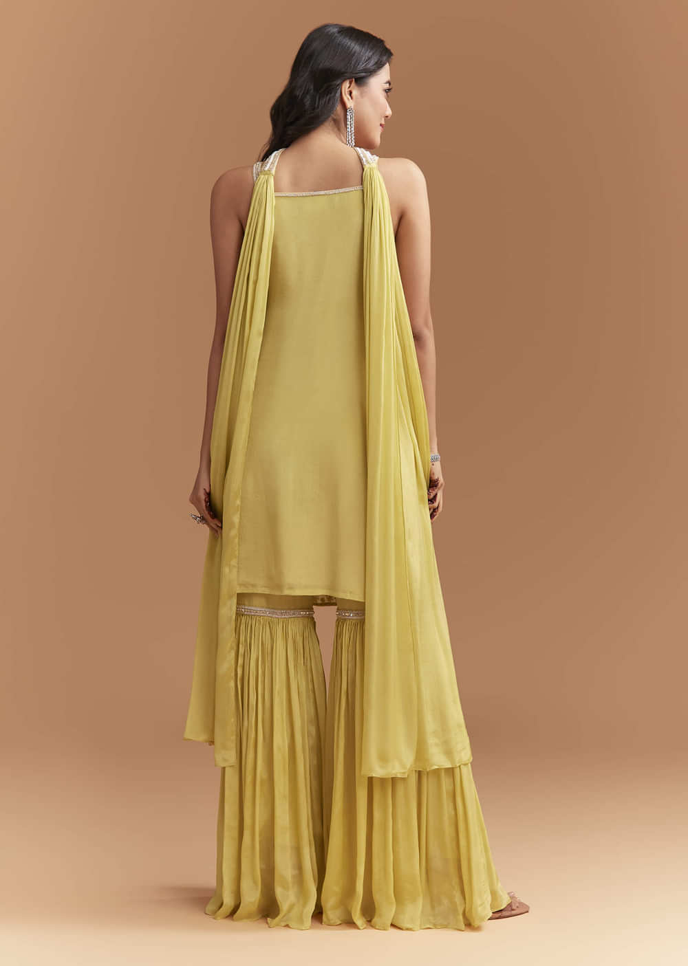 The kurta should sit tidy across the shoulders, while the sharara rests at the waist with a wide, swishy flare.