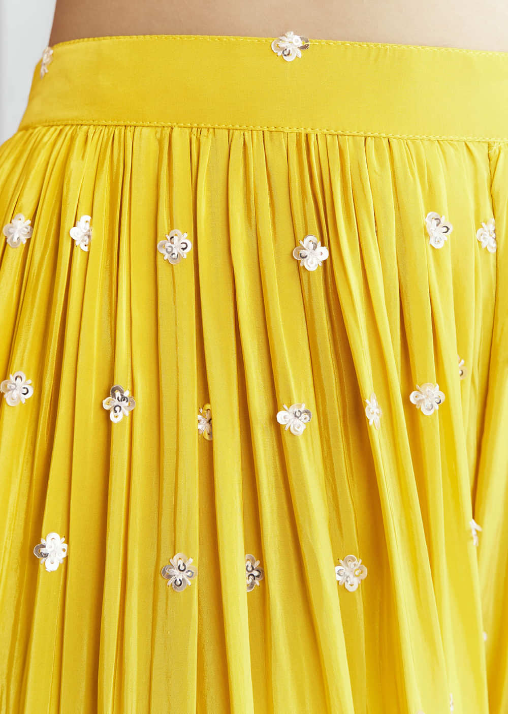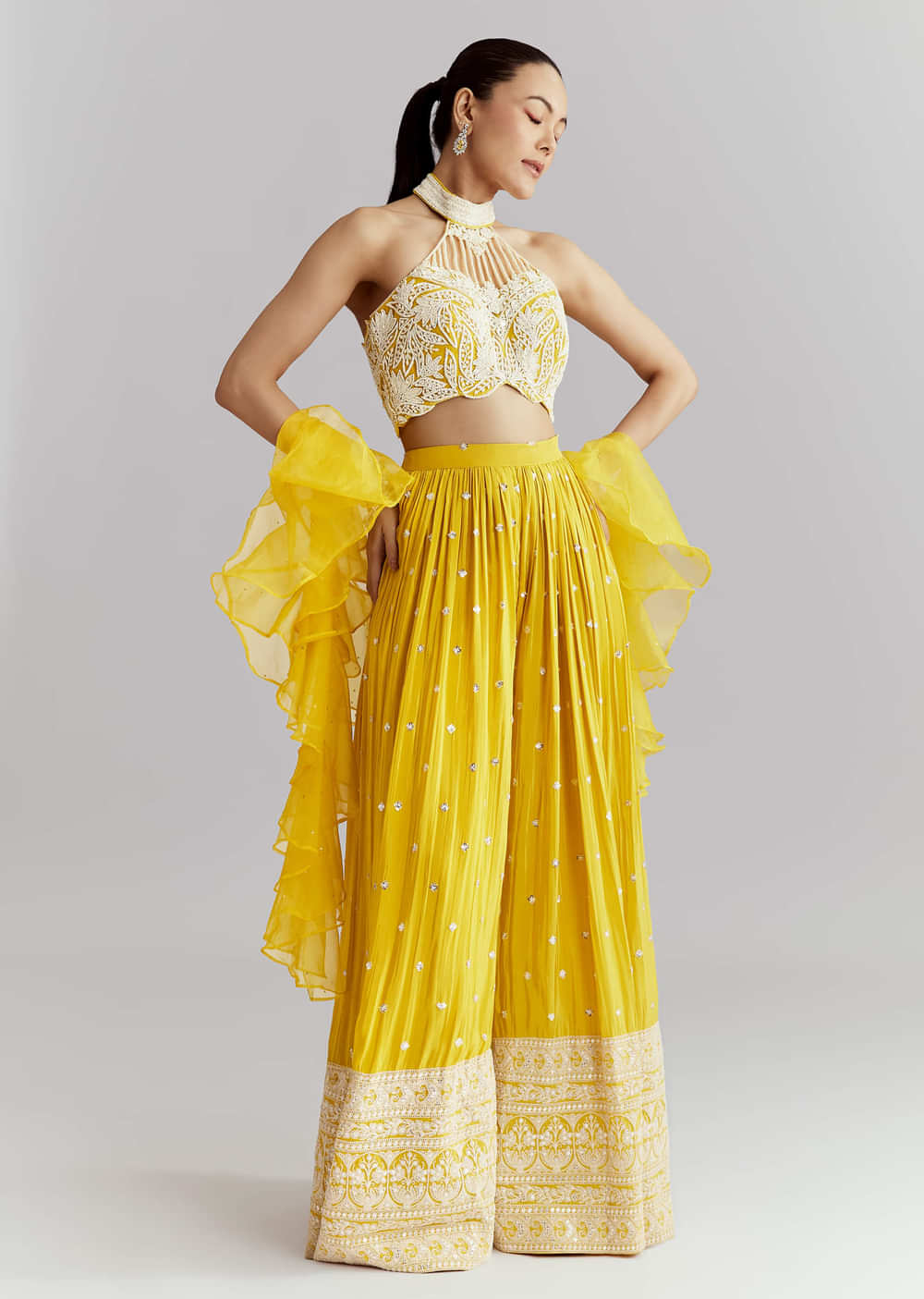 Yellow Crepe Crop Top Palazzo Pant Set With Embroidery