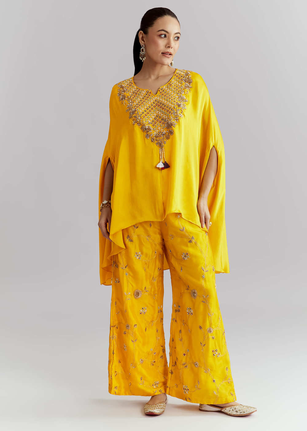 For a statement that still moves easily, this yellow crepe indo western set features a cape-style top and fine hand work. The embroidery mixes zardosi, moti and sequins for a... More Product Details