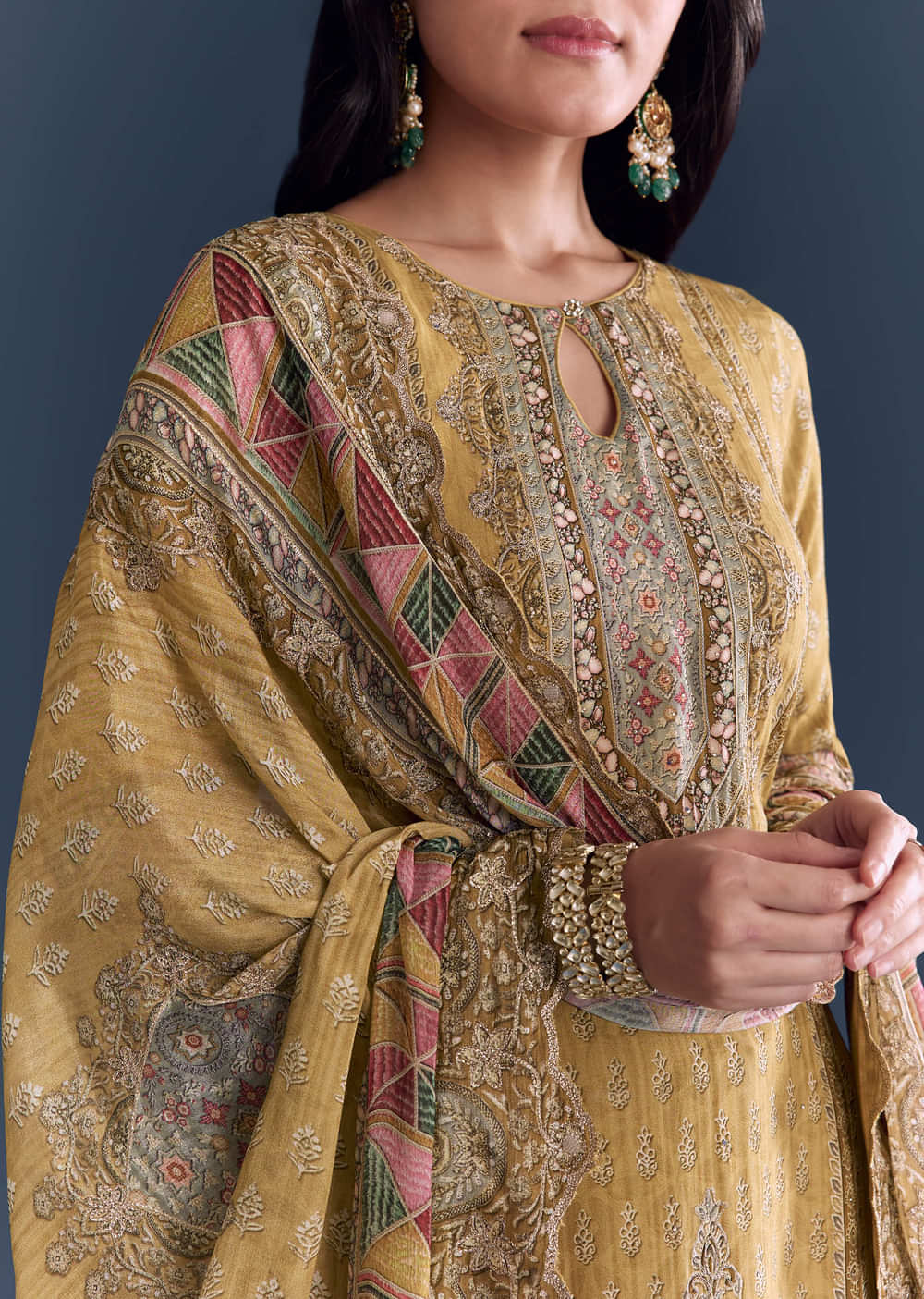 Yellow Crepe Kurta Set With Indie Print And Zari Embroidery