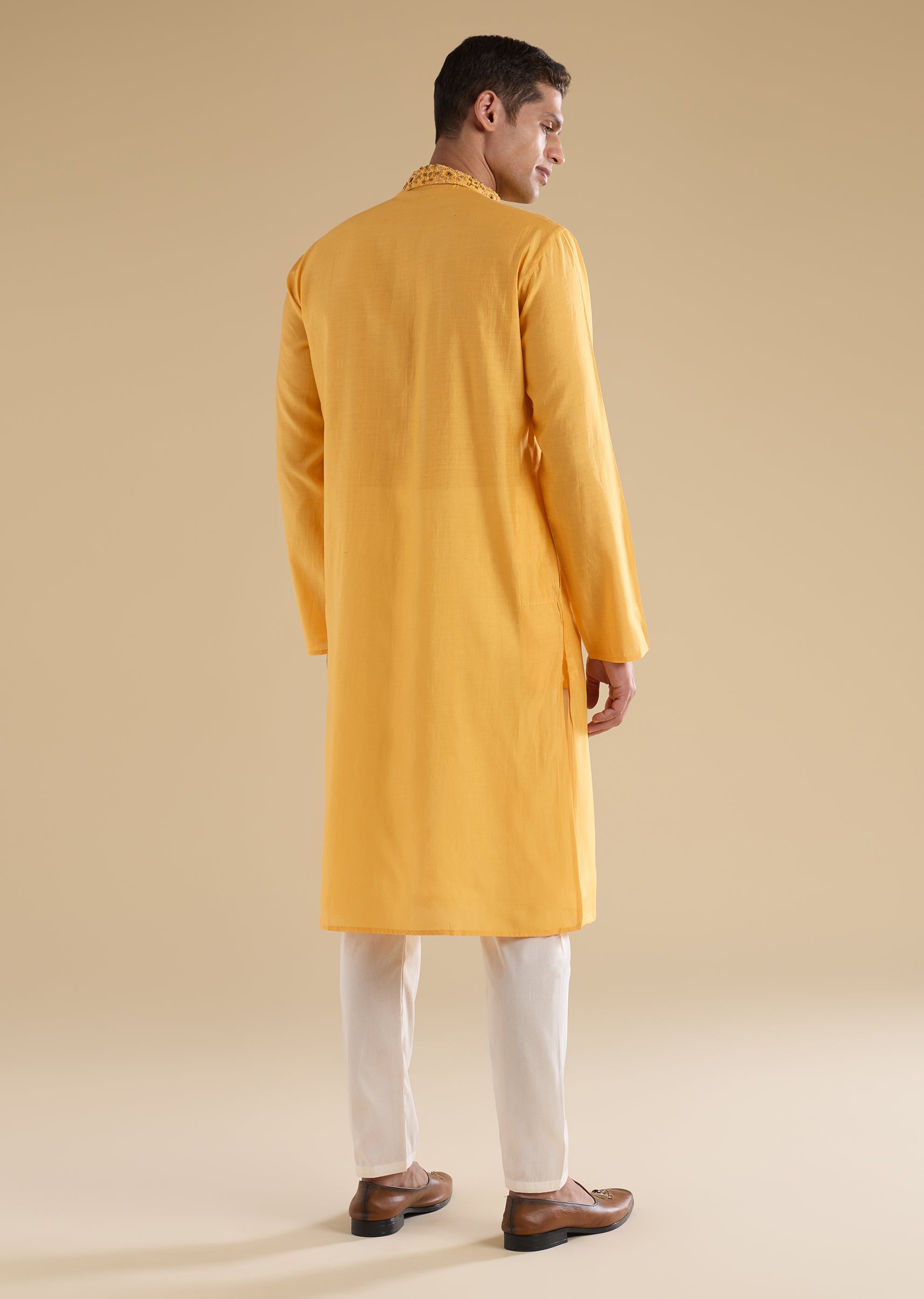 Bright and festive with graceful detailing, this yellow kurta set is crafted in smooth silk-blend fabric for a traditional yet comfortable look. The kurta features a mandarin collar, full sleeves,... More Product Details