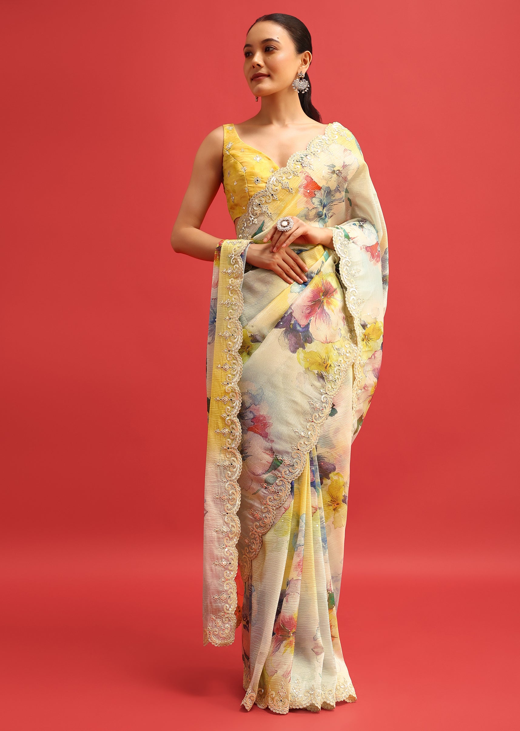 Imagine a sun kissed meadow its vibrant hues captured in a single breath taking masterpiece. Our yellow organza saree is just that. Delicate florals dance across the fabric while a shimmering sequin border adds a touch of celestial magic. Perfect for those special occasions when you want to radiate joy and grace. The saree is paired with an unstitched blouse. Awarded as the Most Trusted Brand, we're delivering styles you love, just as promised.