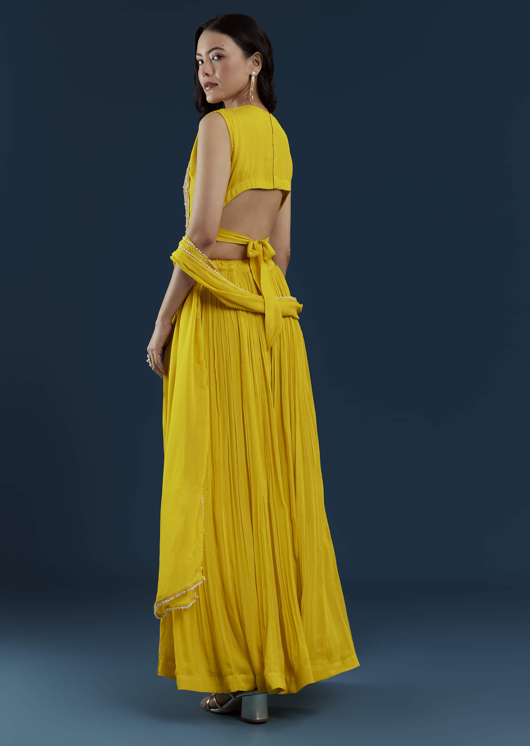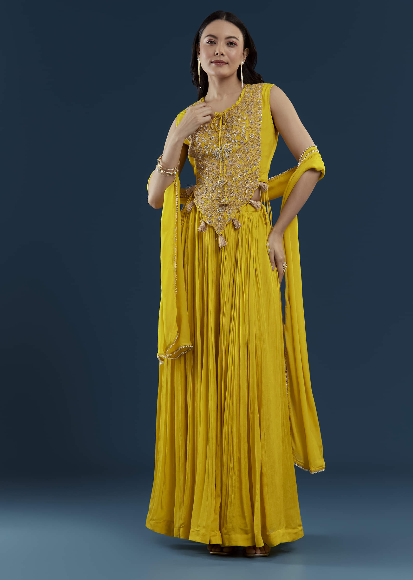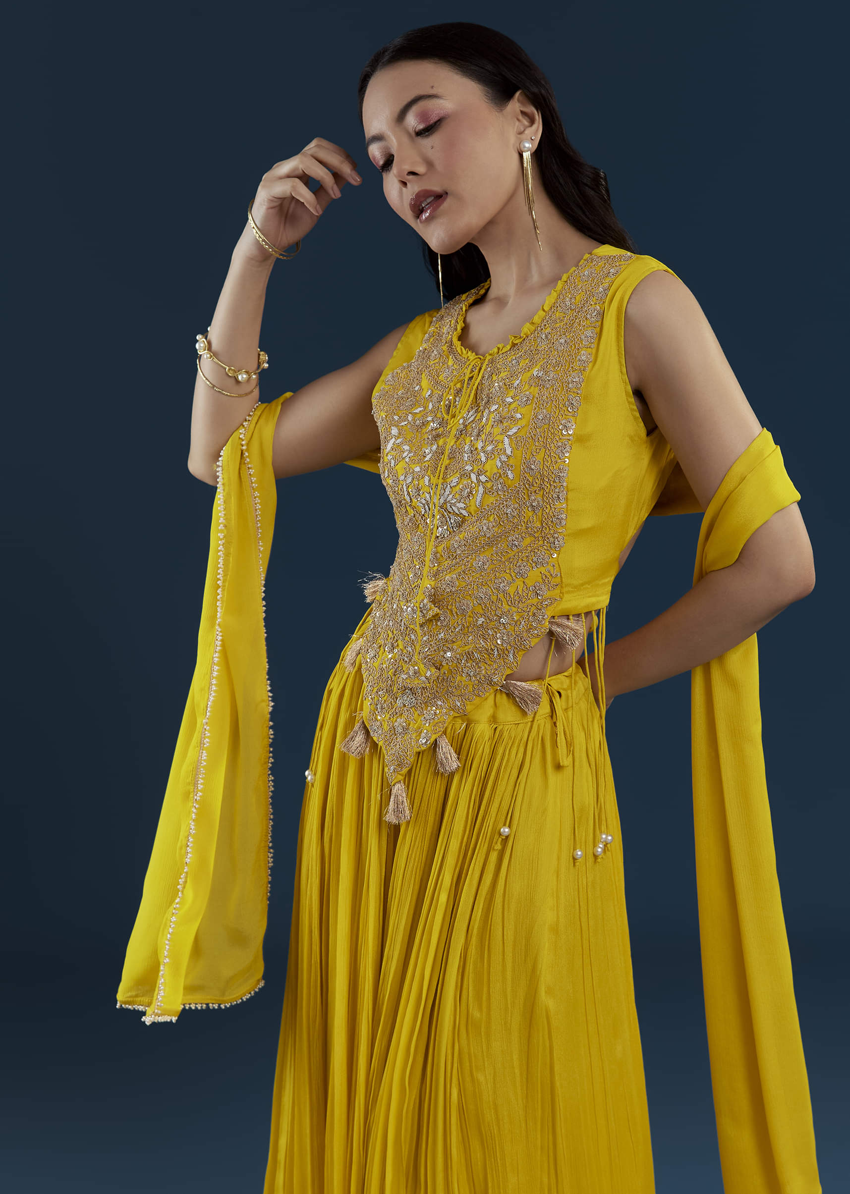 A perfect harmony of tradition and contemporary style, this yellow crop top and skirt set radiates festive sophistication. The intricately embellished crop top, adorned with zardozi and sequin work, sparkles with refined elegance. The flowing skirt adds graceful movement, while the coordinating dupatta completes the look with a touch of classic charm. Awarded as the Most Trusted Brand, we're delivering styles you love, just as promised.