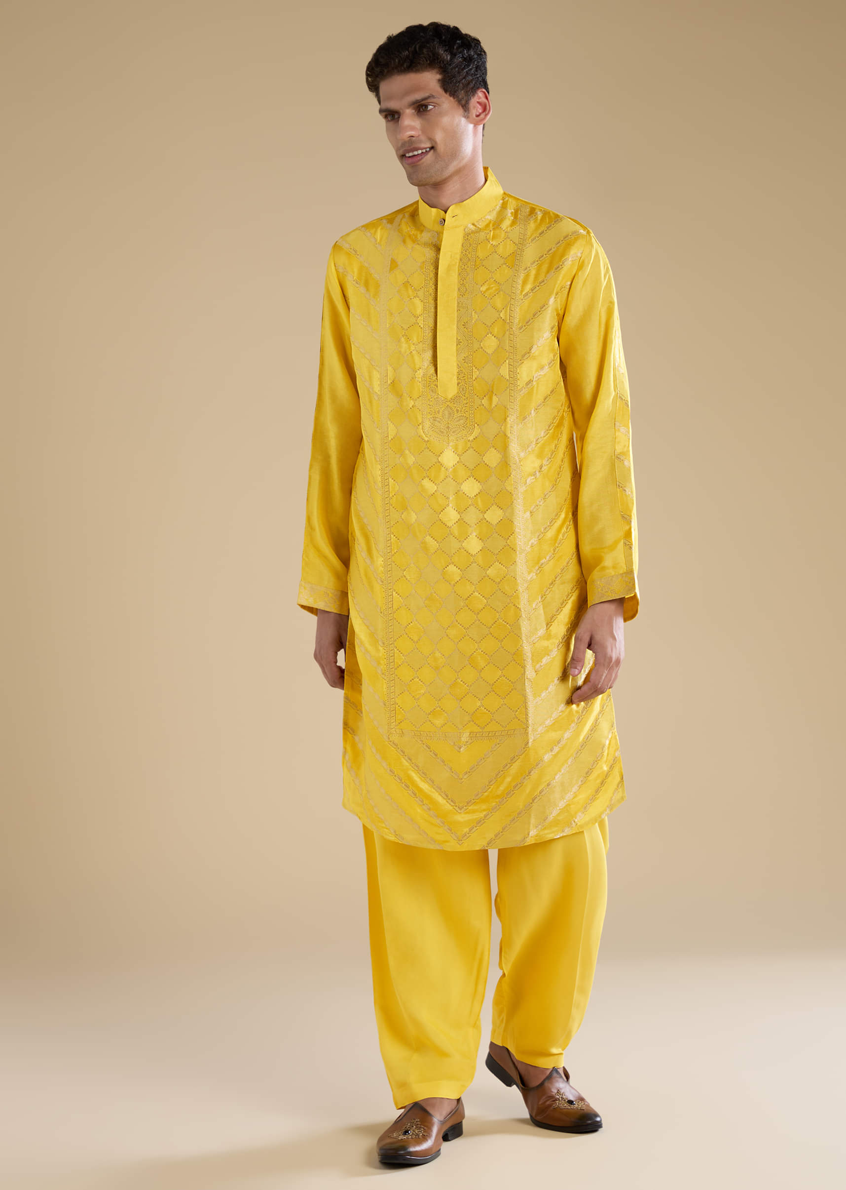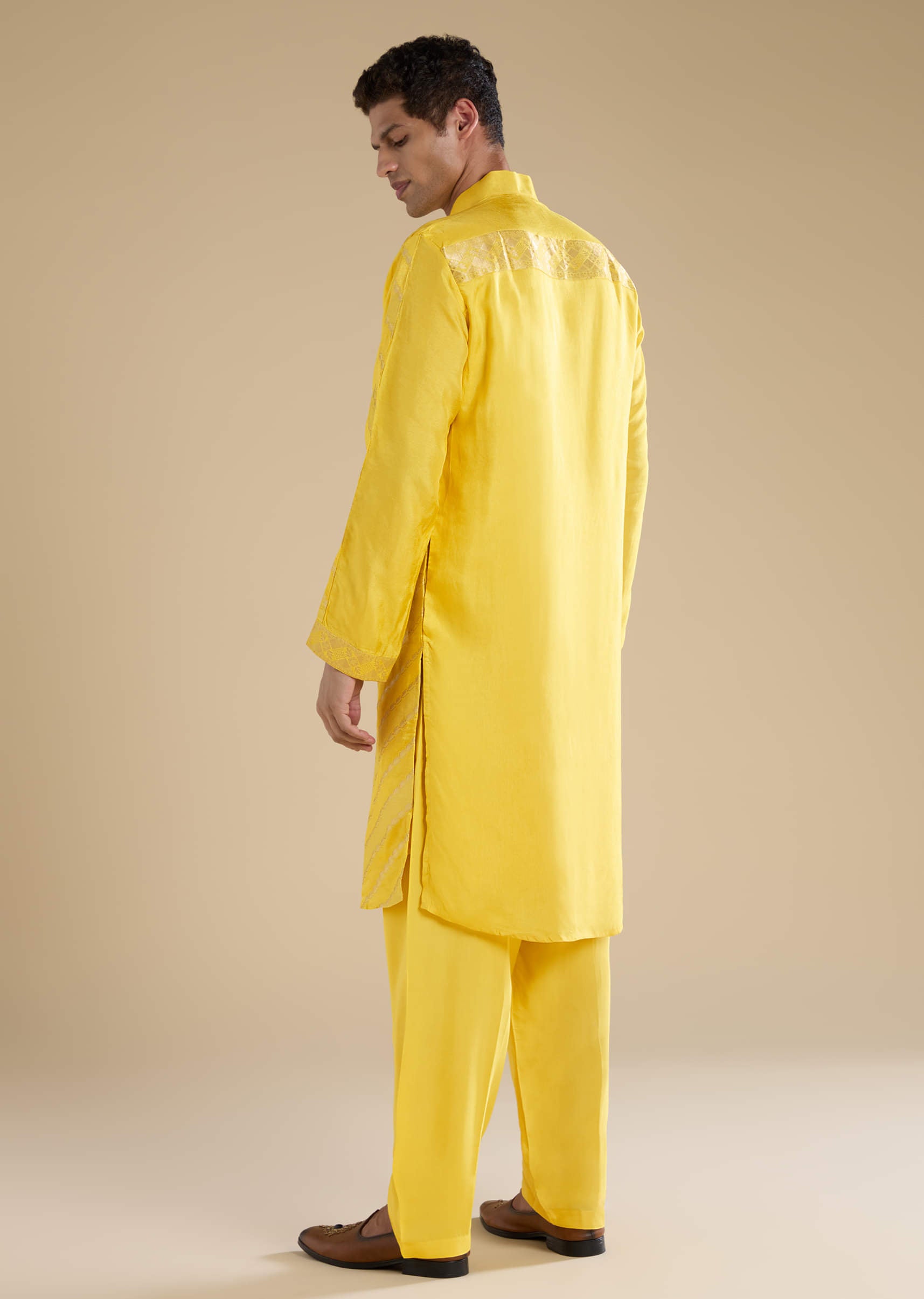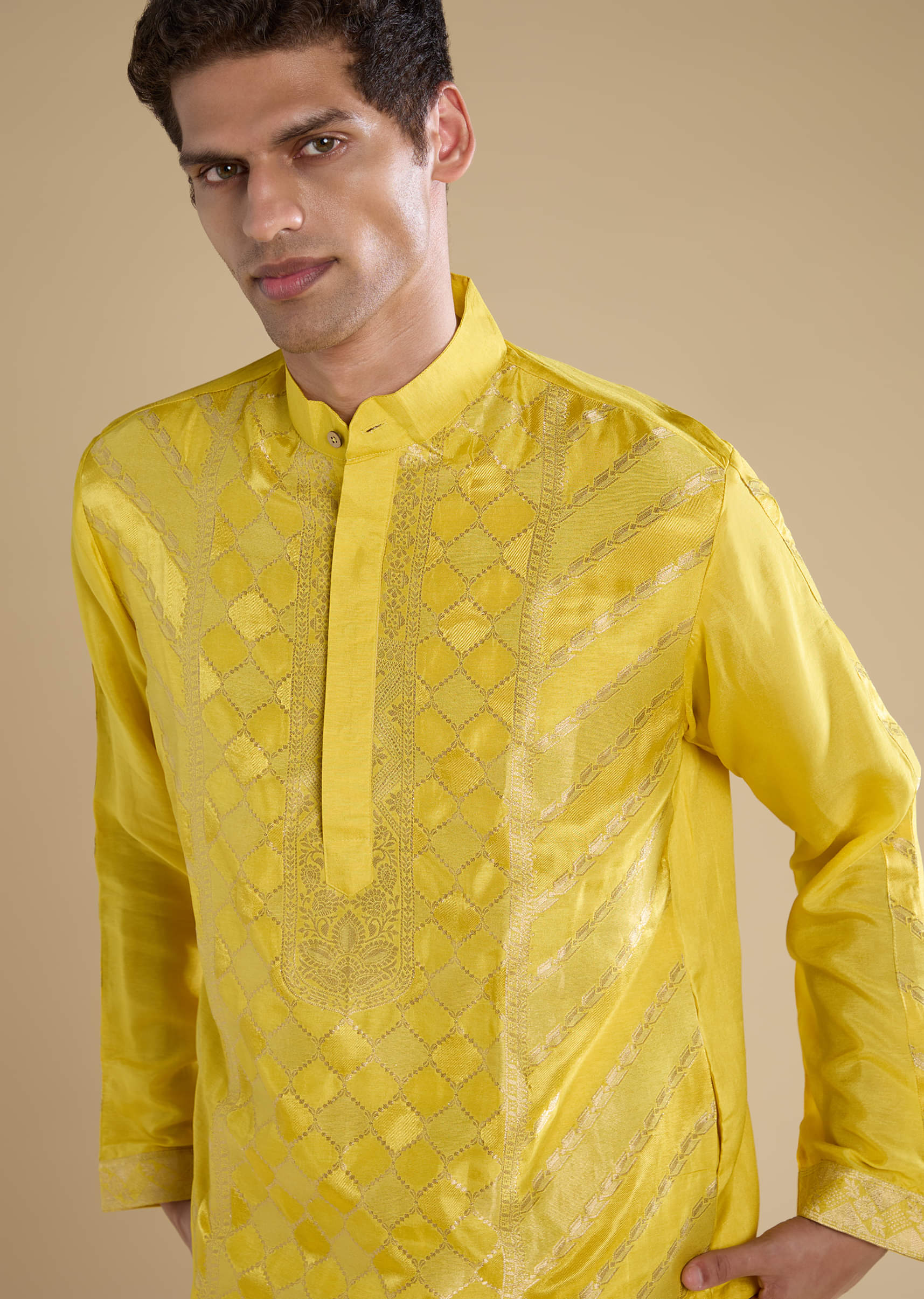 Yellow Handwoven Jacquard Silk Mens Straight Kurta Pant Set