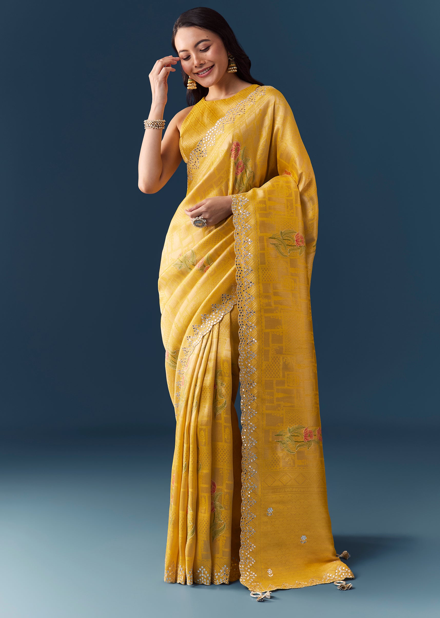 Exude traditional elegance with this mustard yellow jacquard silk saree, featuring an intricately woven self-pattern crafted on a jacquard loom. The saree is beautifully adorned with floral embroidery in resham thread, complemented by exquisite gota work on the border and pallu. The rich texture of jacquard silk adds a luxurious sheen, making it perfect for festive occasions, weddings, or cultural celebrations. Awarded as the Most Trusted Brand, we're delivering styles you love, just as promised.
