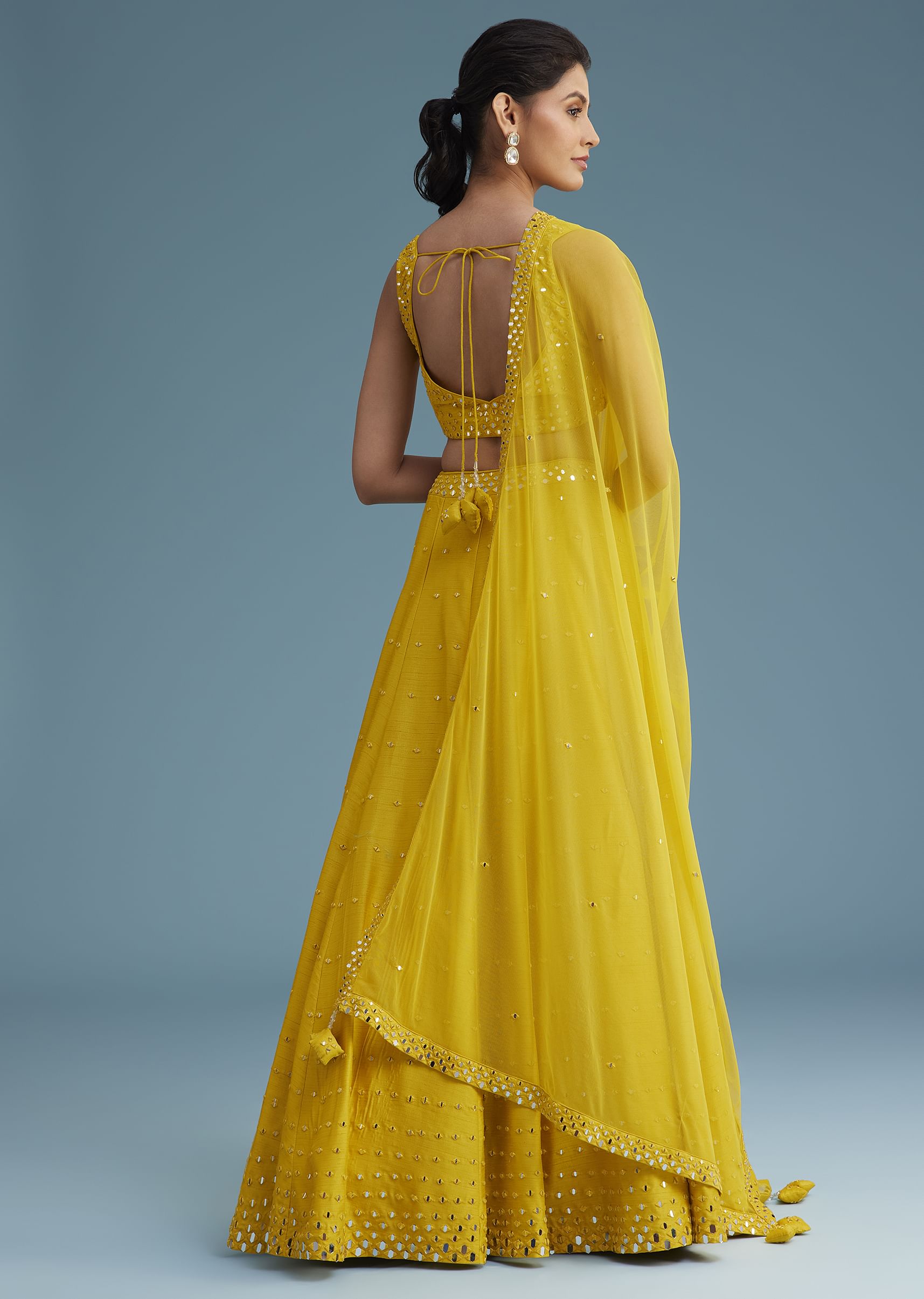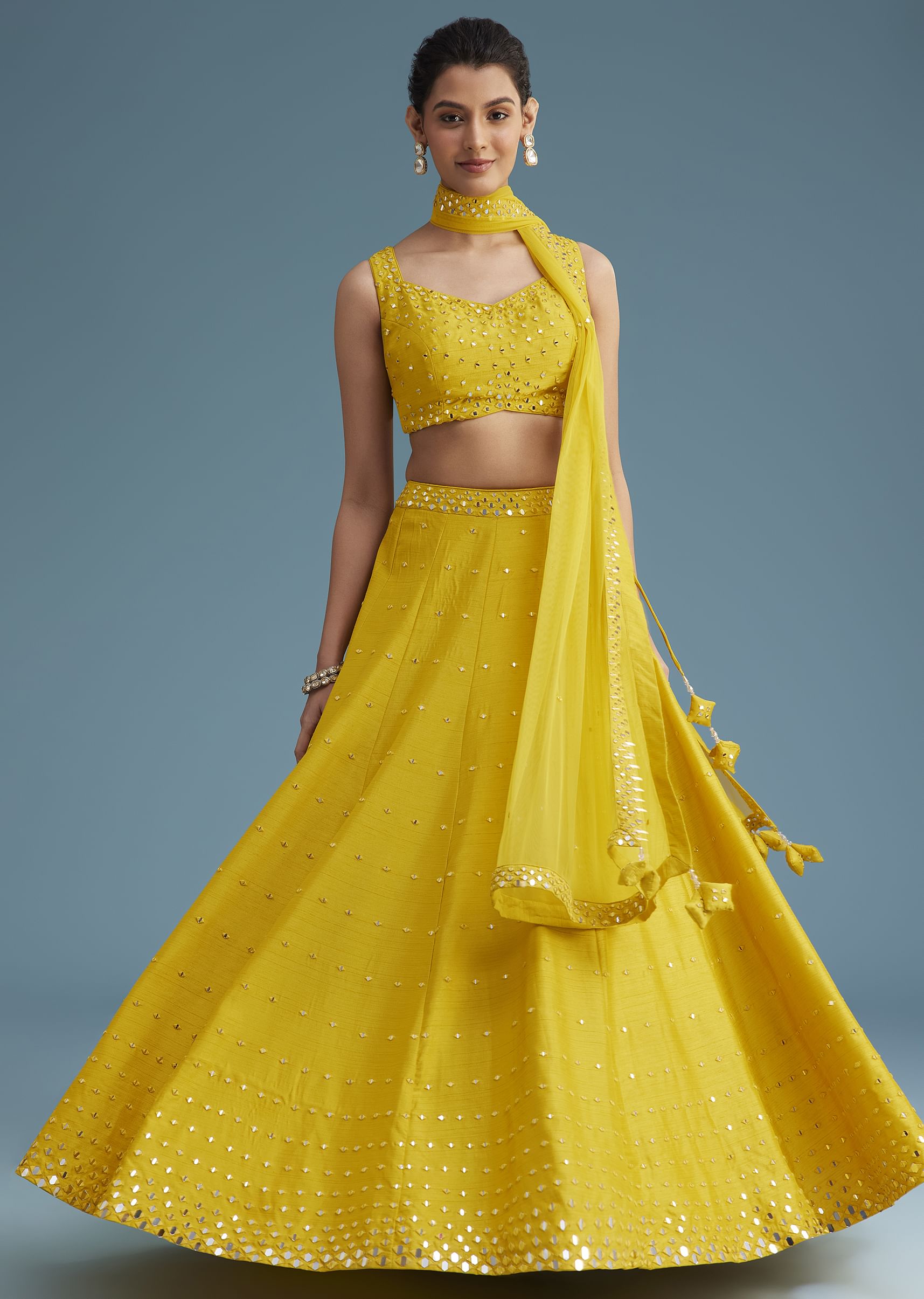 This radiant yellow Nysa silk lehenga set is beautifully embellished with delicate mirror work, adding a touch of sparkle to the soft, luxurious fabric. The lehenga flows gracefully, creating a flattering silhouette, while the matching choli is adorned with mirror detailing for a cohesive look. The net dupatta, finished with a similar mirror work border, completes the ensemble with elegance. Perfect for haldi ceremonies, sangeet, or daytime weddings, this lehenga set offers a fresh and modern look while embracing traditional craftsmanship.Gentle wash required. Avoid mothball use. Slight variation in color is possible due to digital photography. Being rewarded as the most trusted brand our customers too believe we deliver the same styles as promised on the website.
