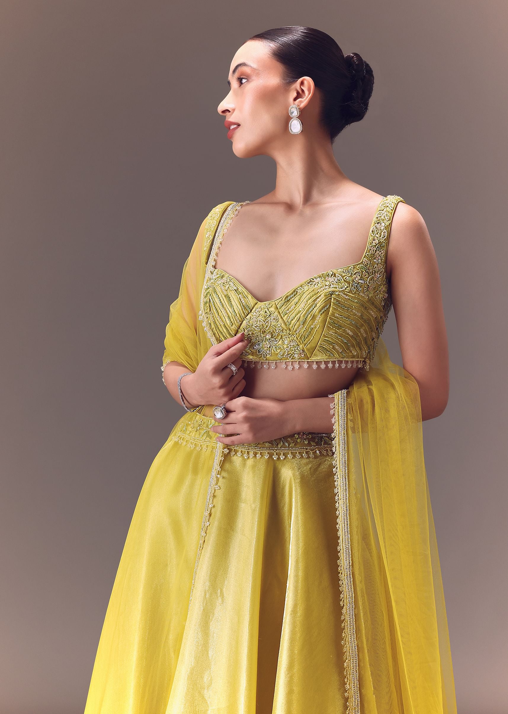 Celebrate traditional elegance and meticulous textures with this yellow lehenga set. Featuring intricate craftsmanship and artistry the self on self work is highlighted with accents of beads and cutdana. Beautifully... More Product Details