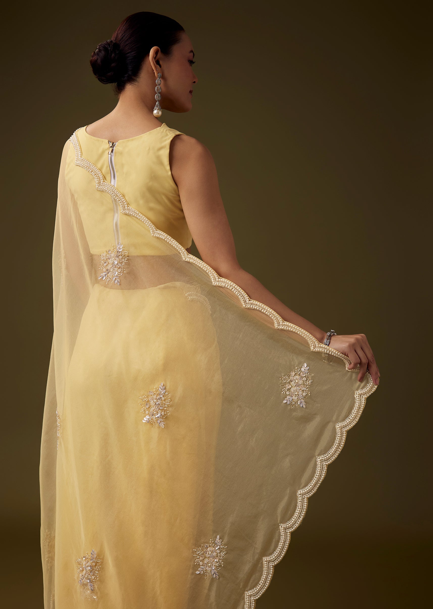Yellow Organza Embroidered Saree with Unstitched Blouse