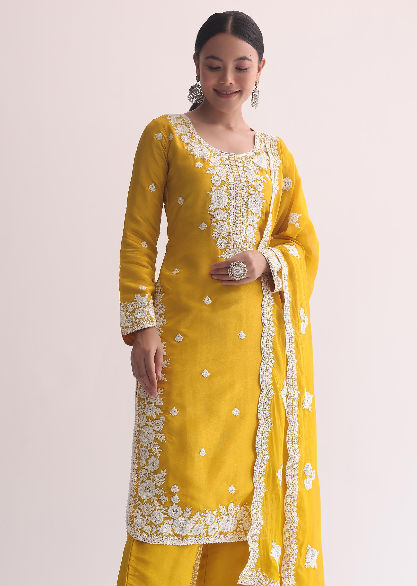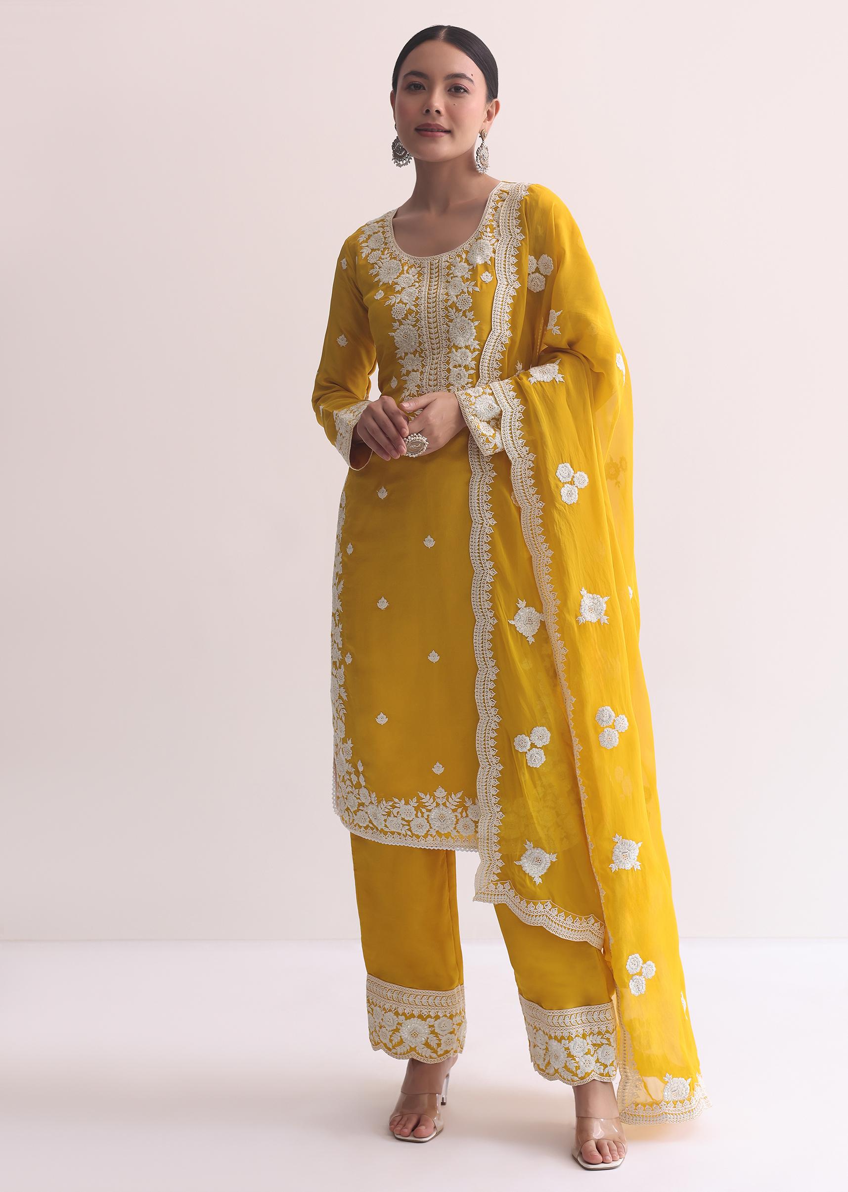 Yellow Organza Resham Threadwork Embroiderd Kurti Pant Set