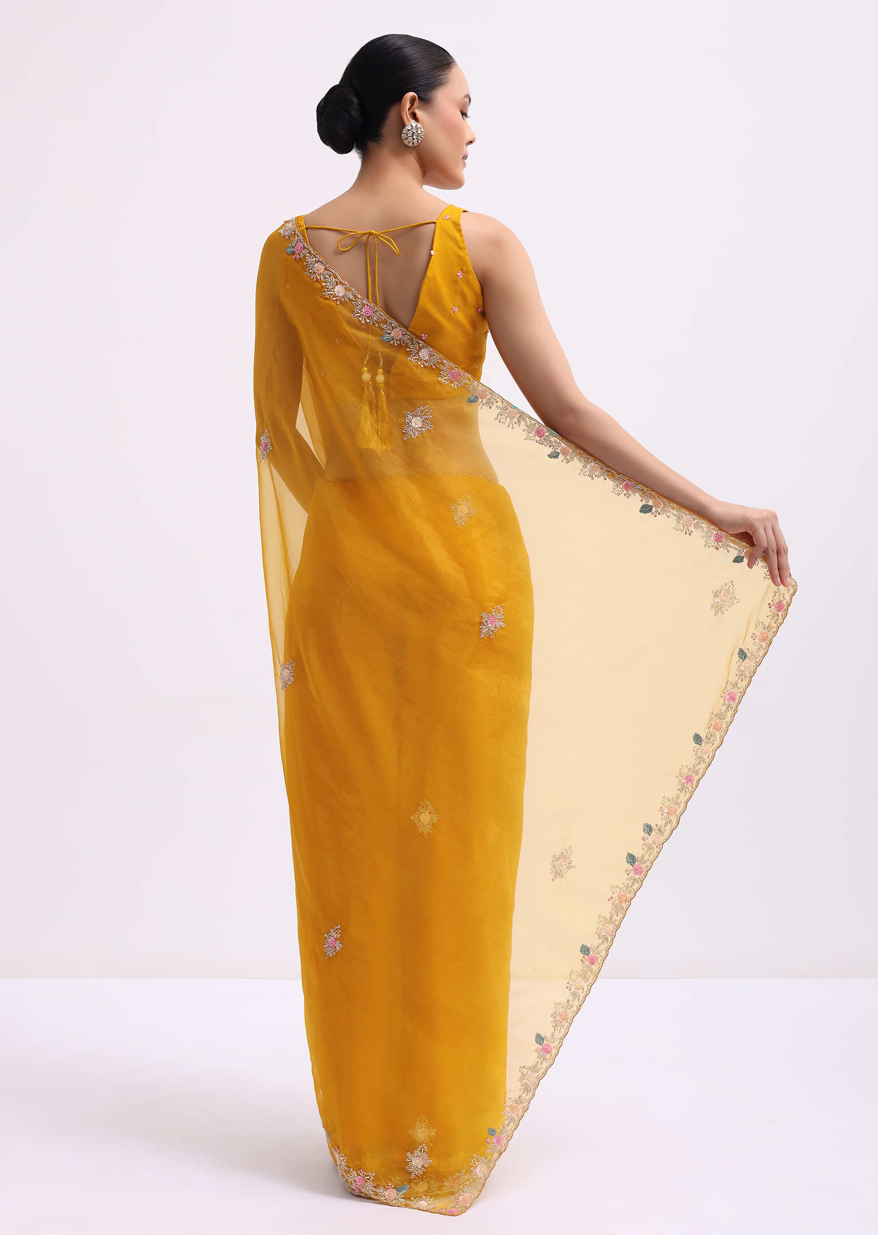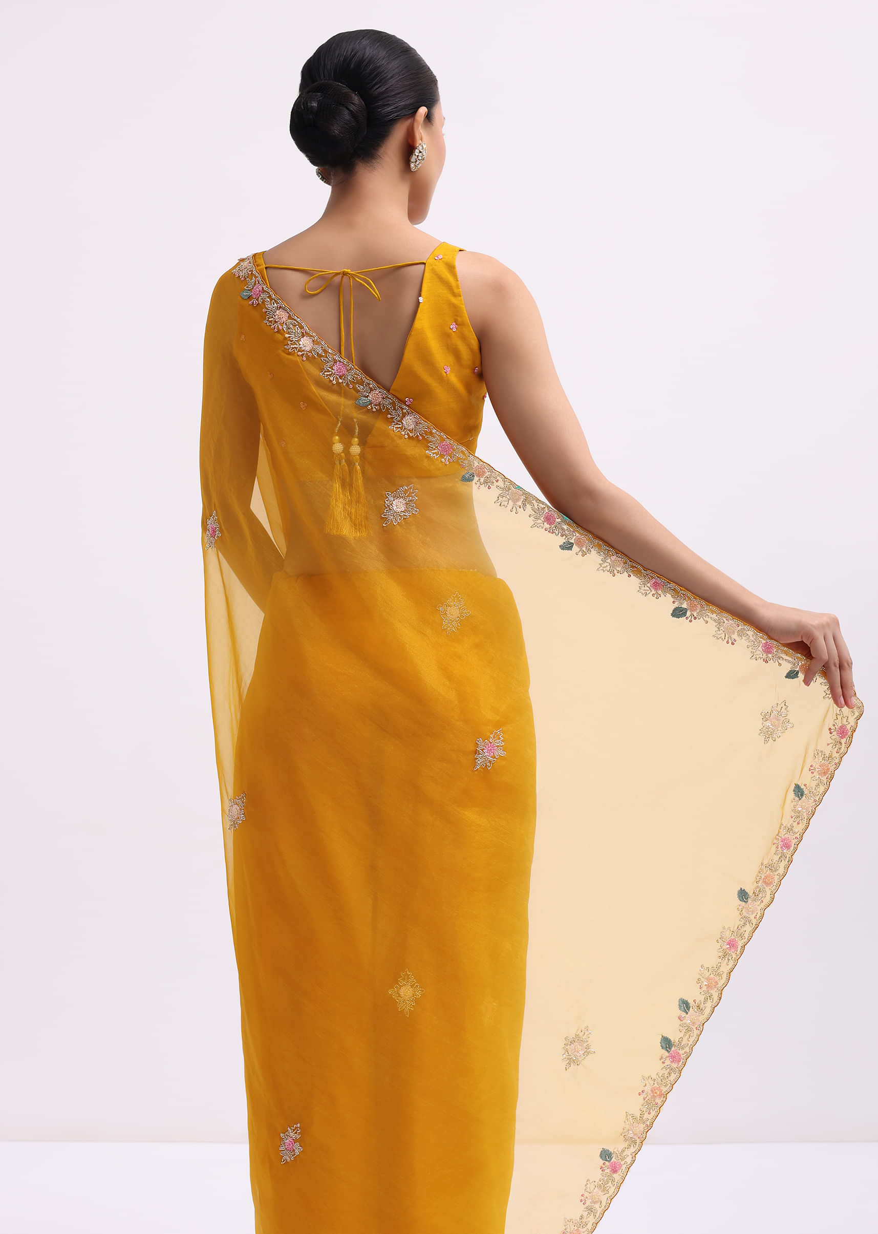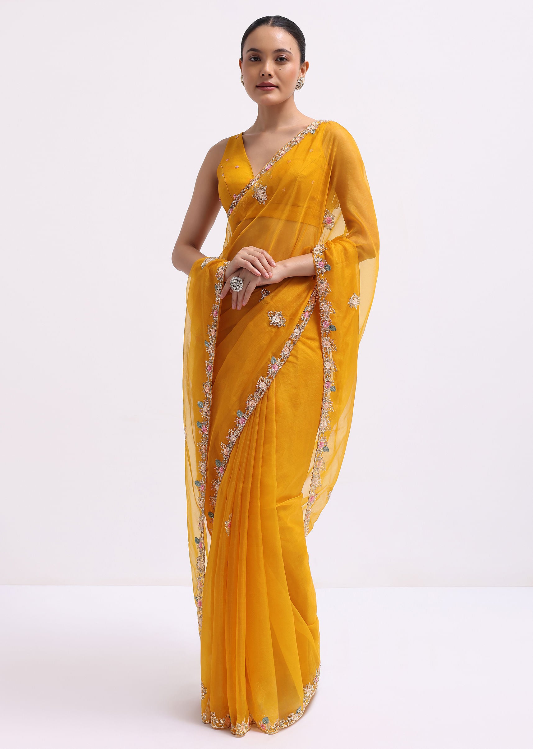 Yellow Organza Saree In 3D Sequins With Unstitched Blouse
