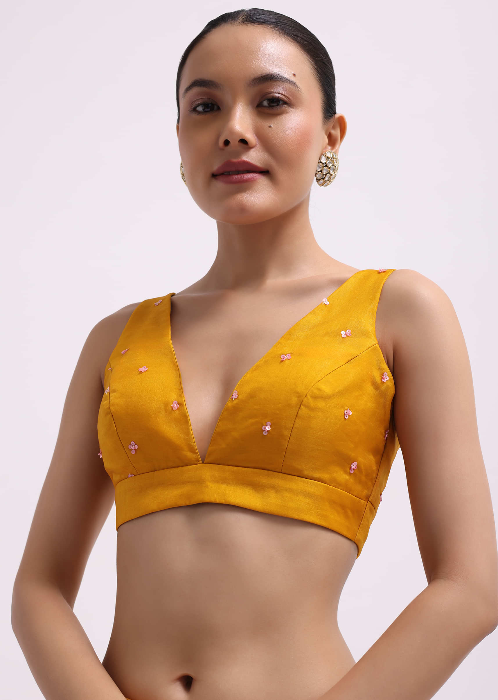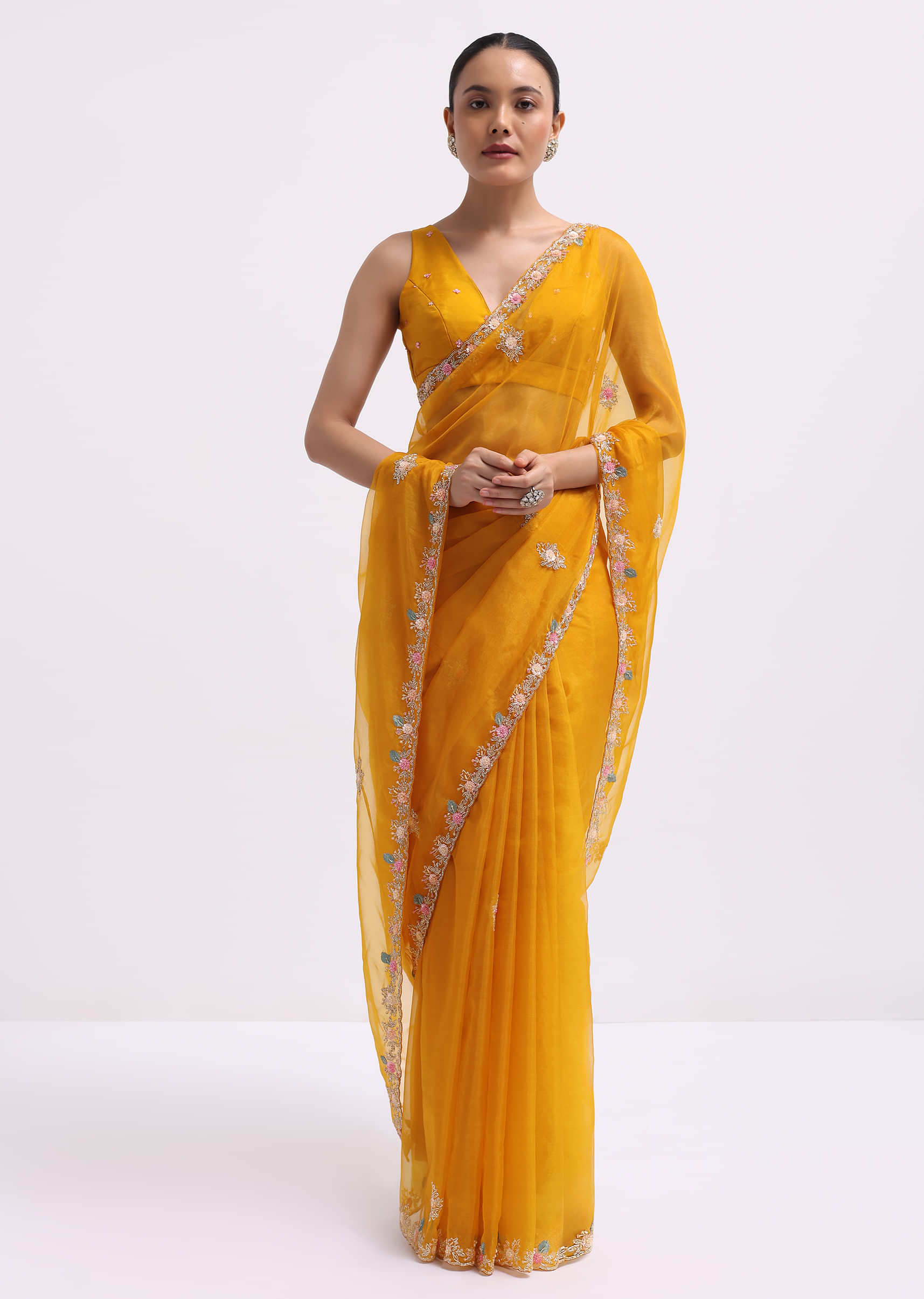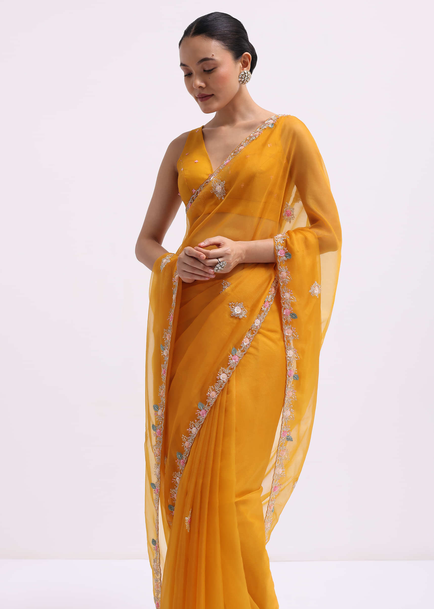 Yellow Organza Saree In 3D Sequins With Unstitched Blouse