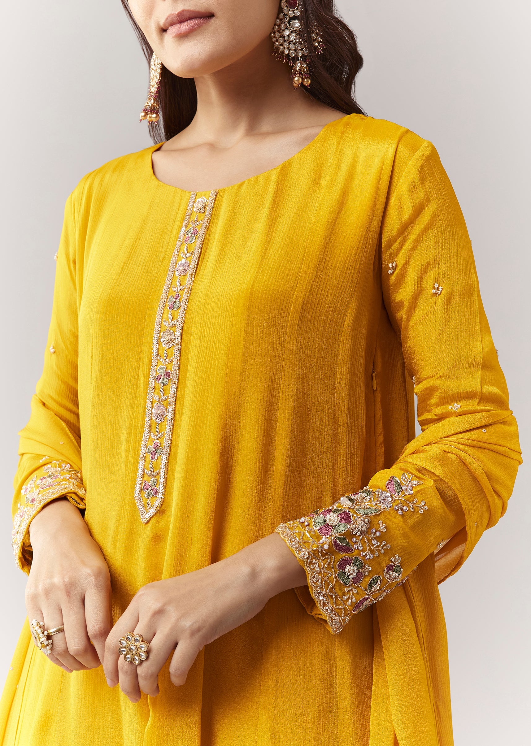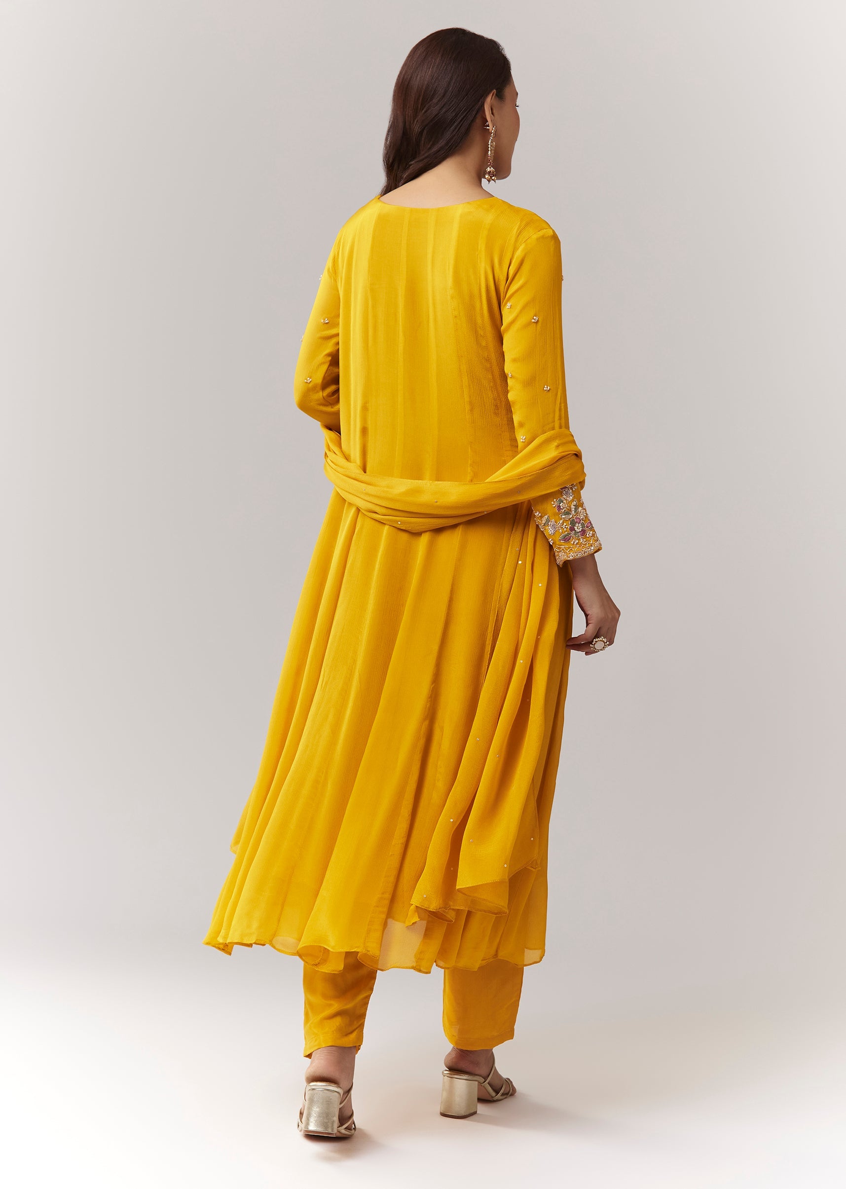 Yellow Resham Cut Dana Sleeve Anarkali Pant Set With Dupatta