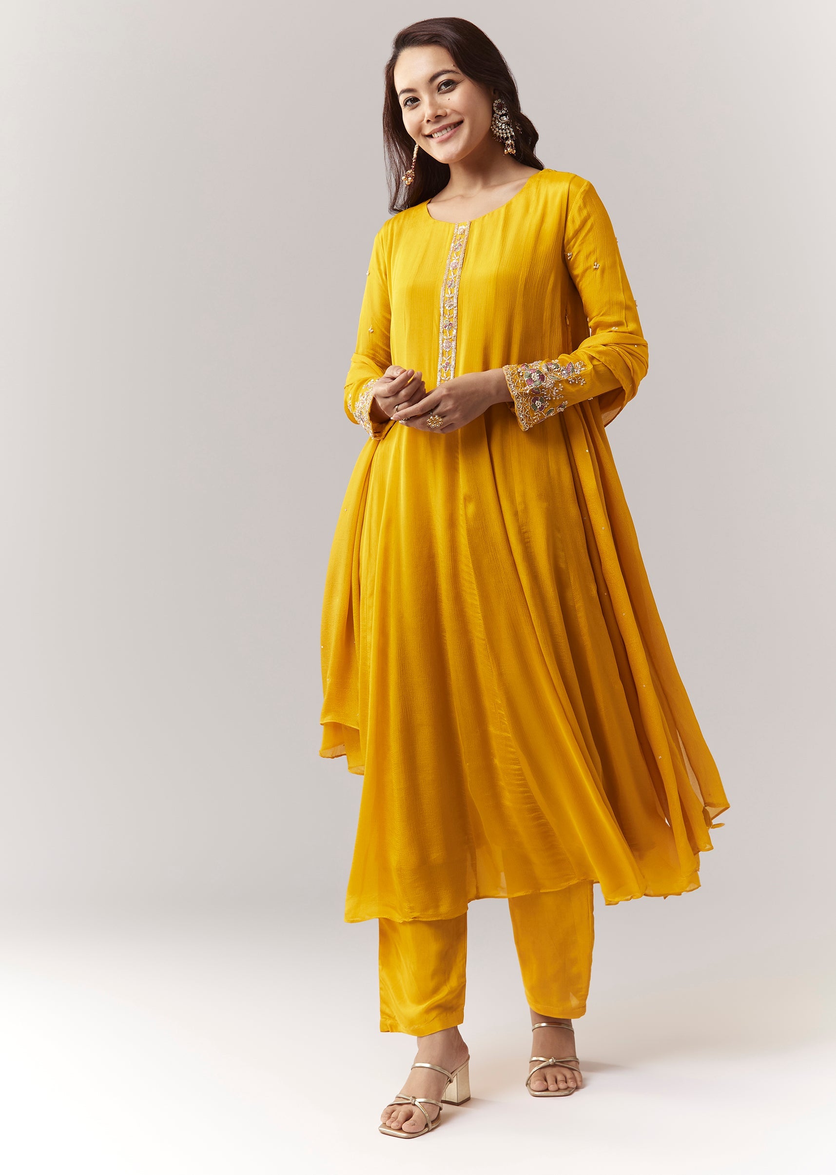 A bright festive yellow chinon anarkali with resham + cut-dana sleeve detailing, paired with straight pants and dupatta. Minimal, graceful, and easy to wear. Awarded as the Most Trusted Brand,... More Product Details