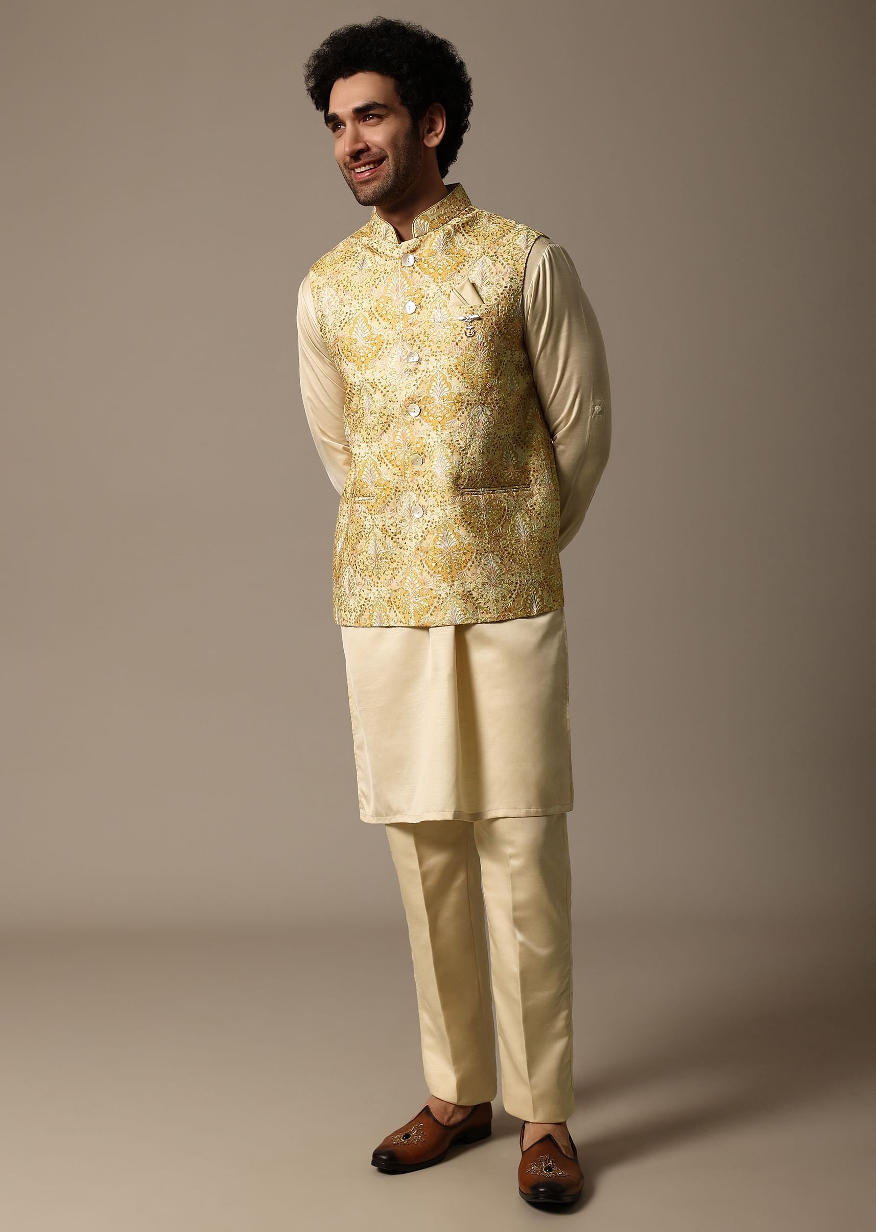 - Embrace the captivating allure of our meticulously crafted yellow kurta jacket set designed for festive opulence.