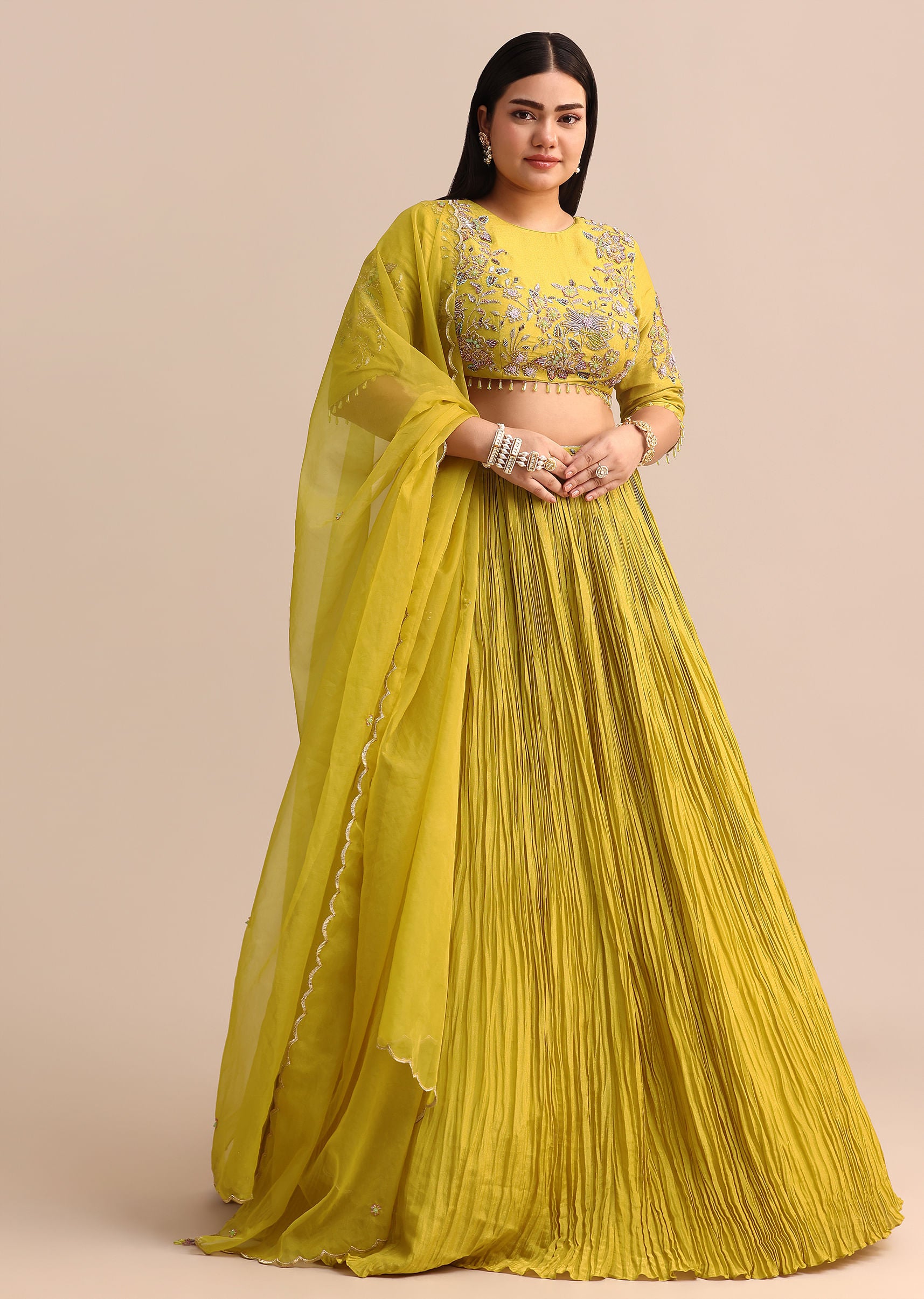 Yellow Ruched Lehenga With Embroidered Blouse And Dupatta