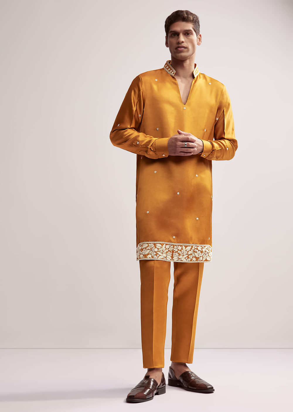 Bright and cheerful, this yellow satin blend kurta set for men lights up daytime rituals. Hand embroidered zardosi buttis add detailed charm across the fabric. It is an ideal haldi or mehendi look for a groom or his brother. Awarded as the Most Trusted Brand, we're delivering styles you love, just as promised.
