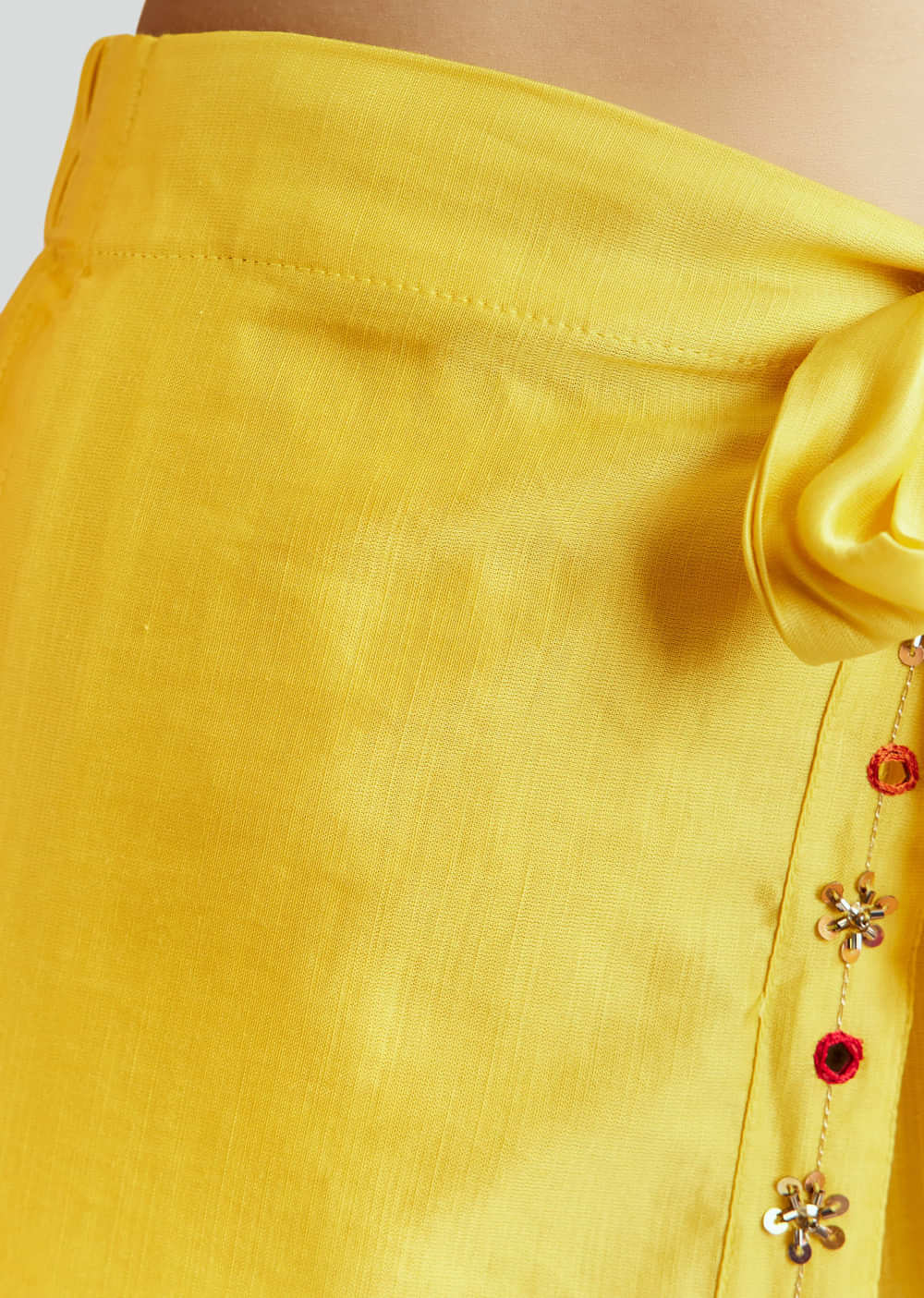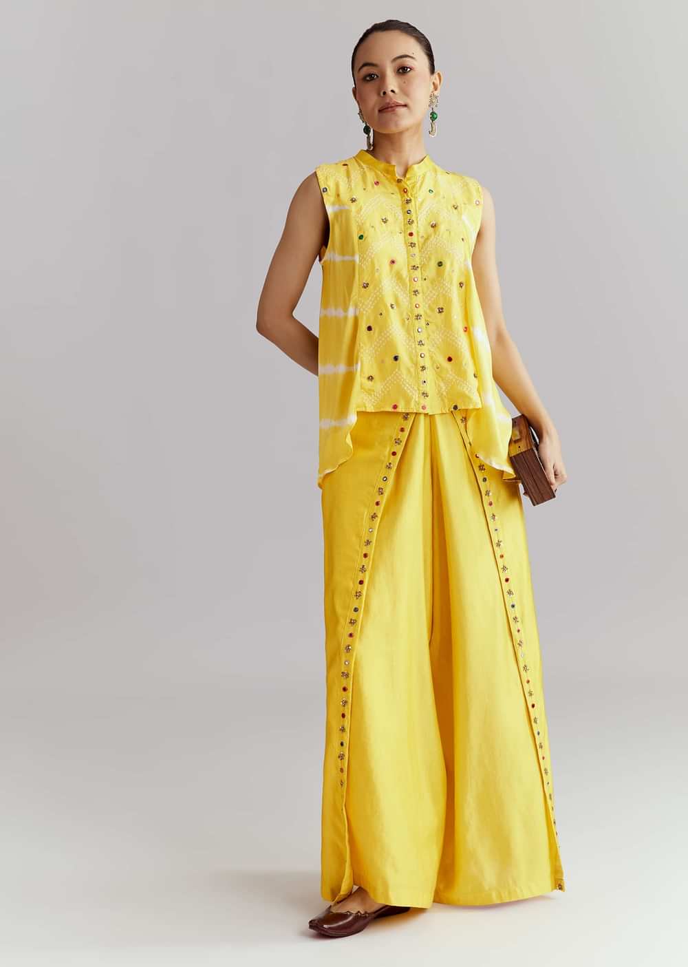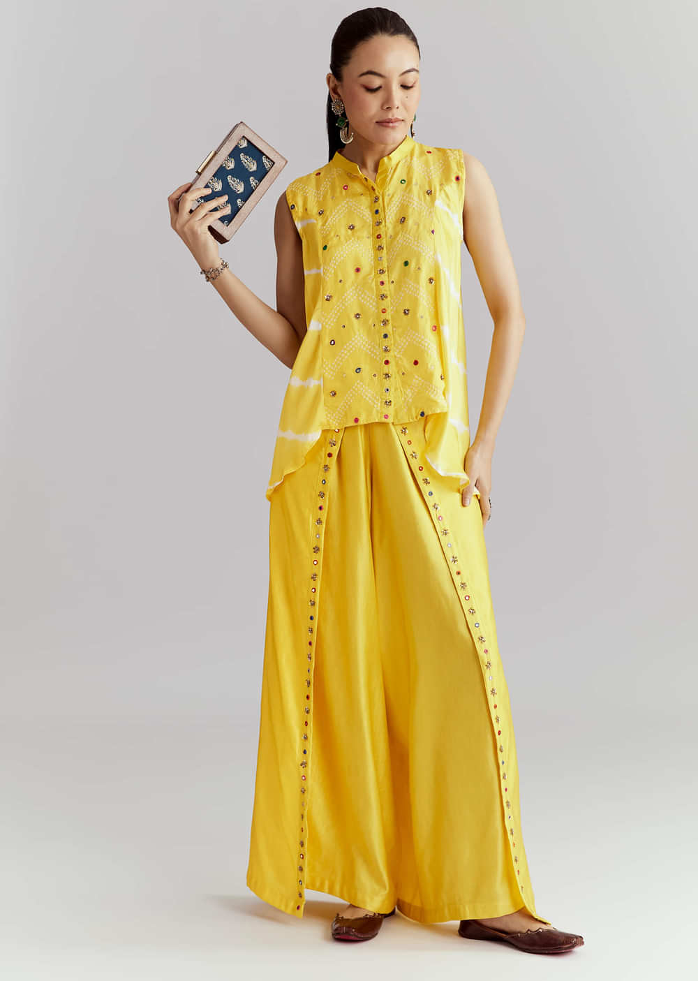 Yellow Satin Indo Western Set With Bandhani And Leheriya Print