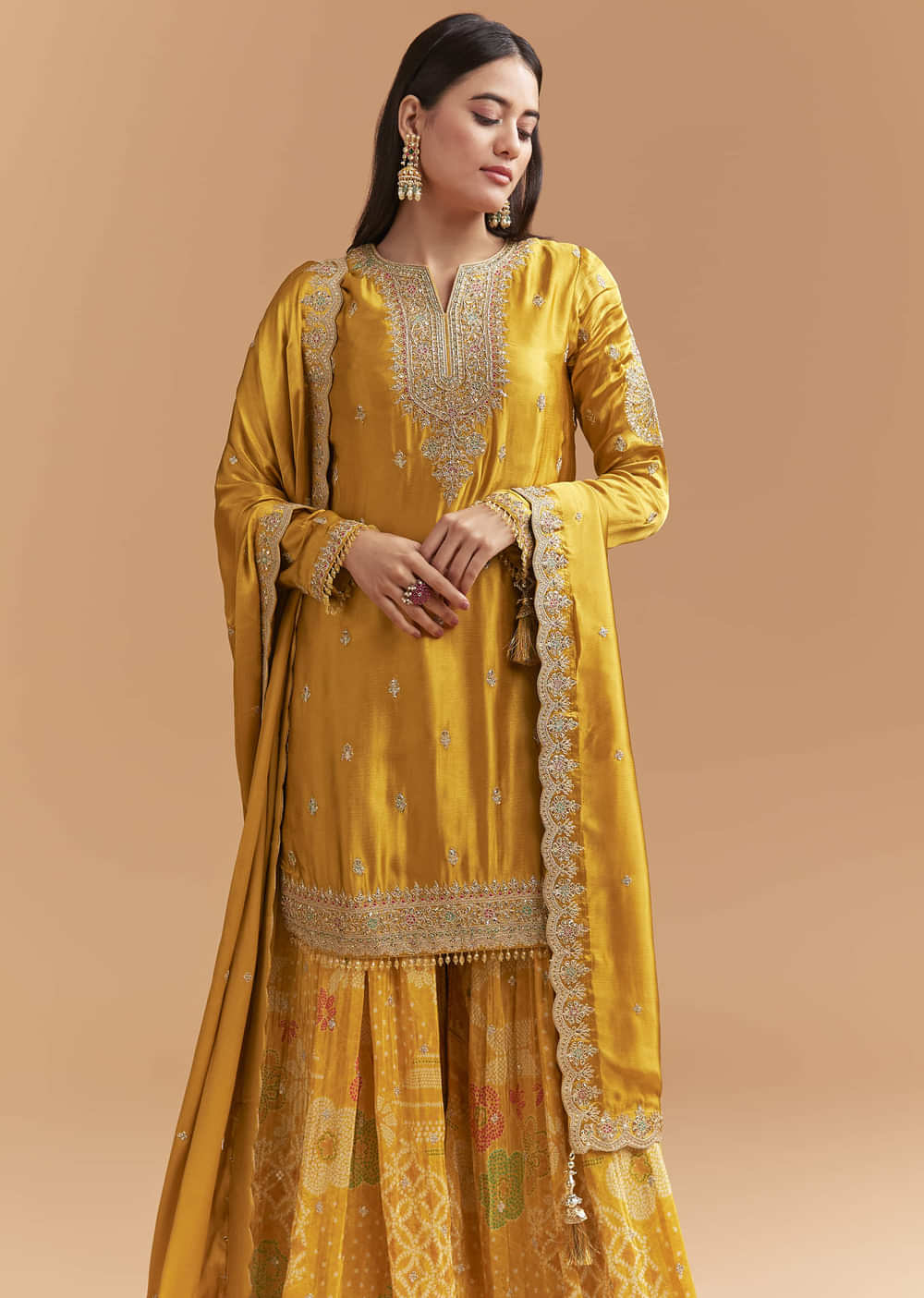 Yellow Satin Palazzo Suit With Gota And Cutdana Work