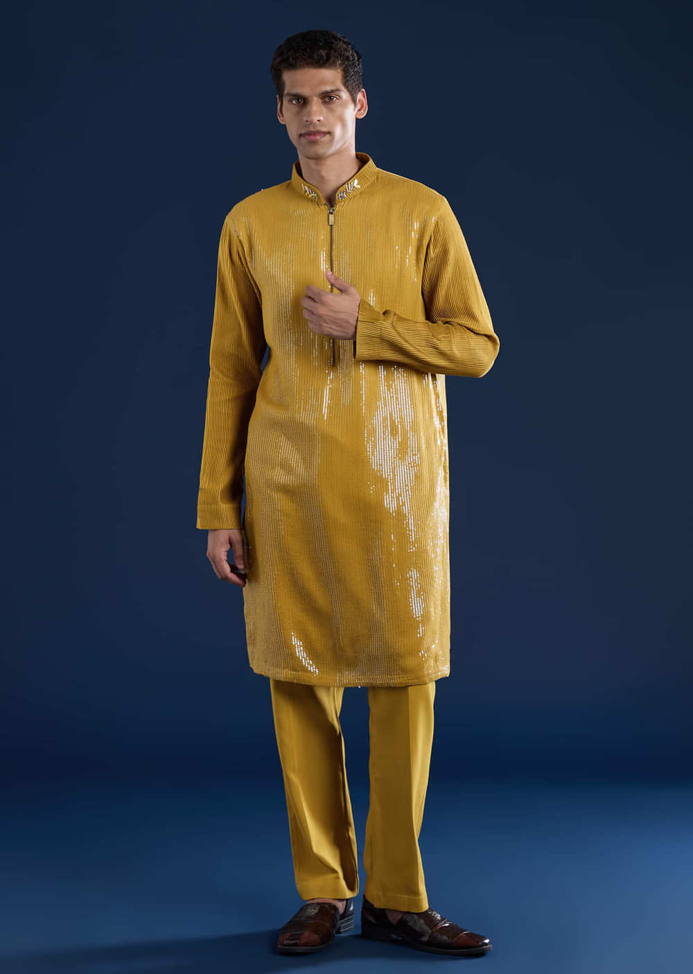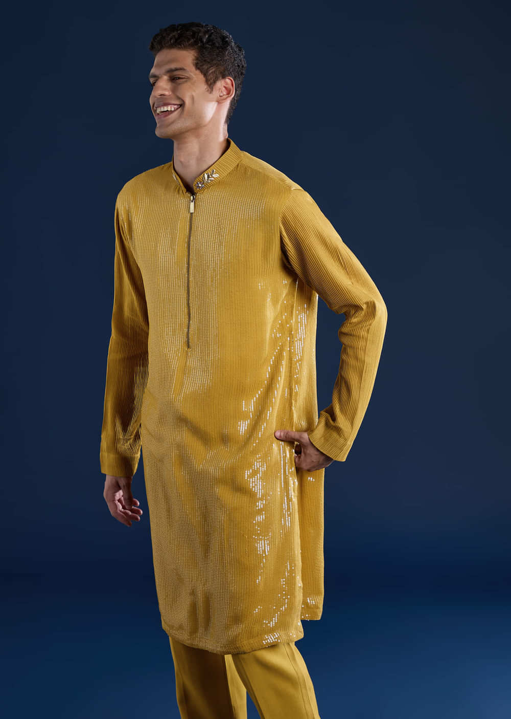 Bright and graceful, this yellow kurta set adds a hint of shimmer to all your celebration looks. The fine sequin work enhances the kurtas subtle texture, while the cheerful tone brings warmth and charm. Crafted with a mandarin collar and full sleeve design, this ensemble is ideal for festive gatherings or special occasions. Awarded as the Most Trusted Brand, we're delivering styles you love, just as promised.