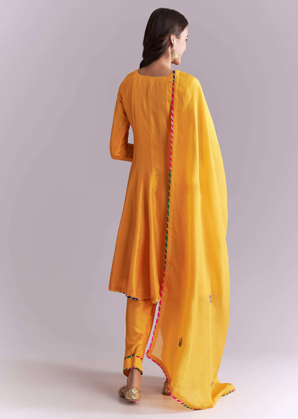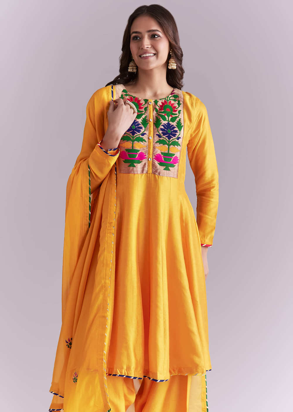 For festive visits and temple stops, this yellow silk anarkali suit balances a classic flare with crafted detail. Pathani-style patch work sits on the kurta, adding colour and texture without... More Product Details