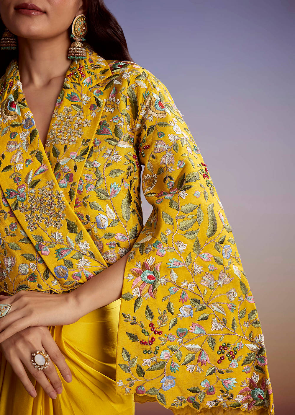 This yellow silk crop top and drape skirt is embedded with resham work that radiates joy. Perfect for haldi, mehendi, or any daytime event where you want the colour... More Product Details