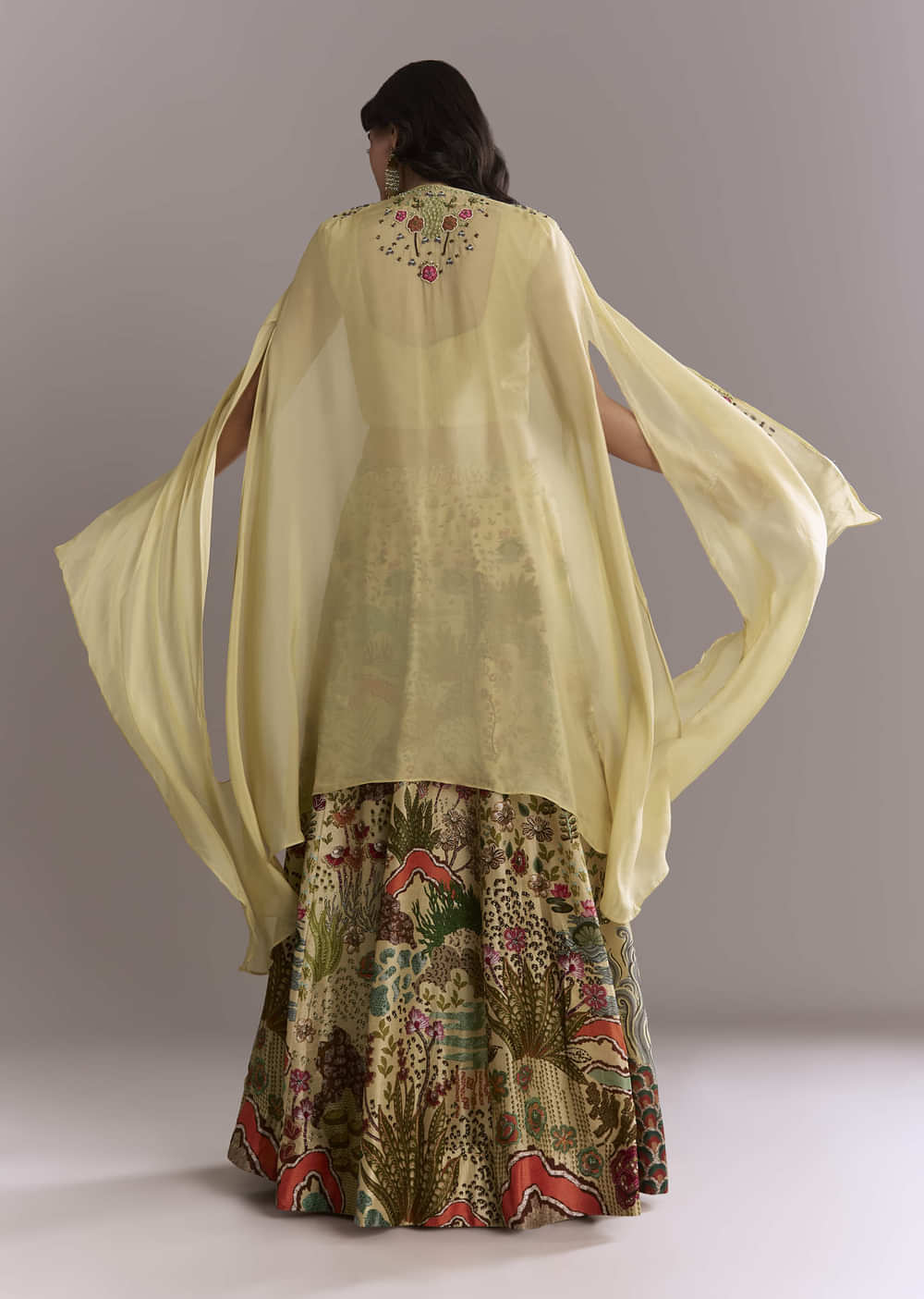 Made for standout entries, this yellow silk crop top and printed skirt set balances a richly worked top in moti, sequins and thread with a breezy printed skirt. A matching... More Product Details