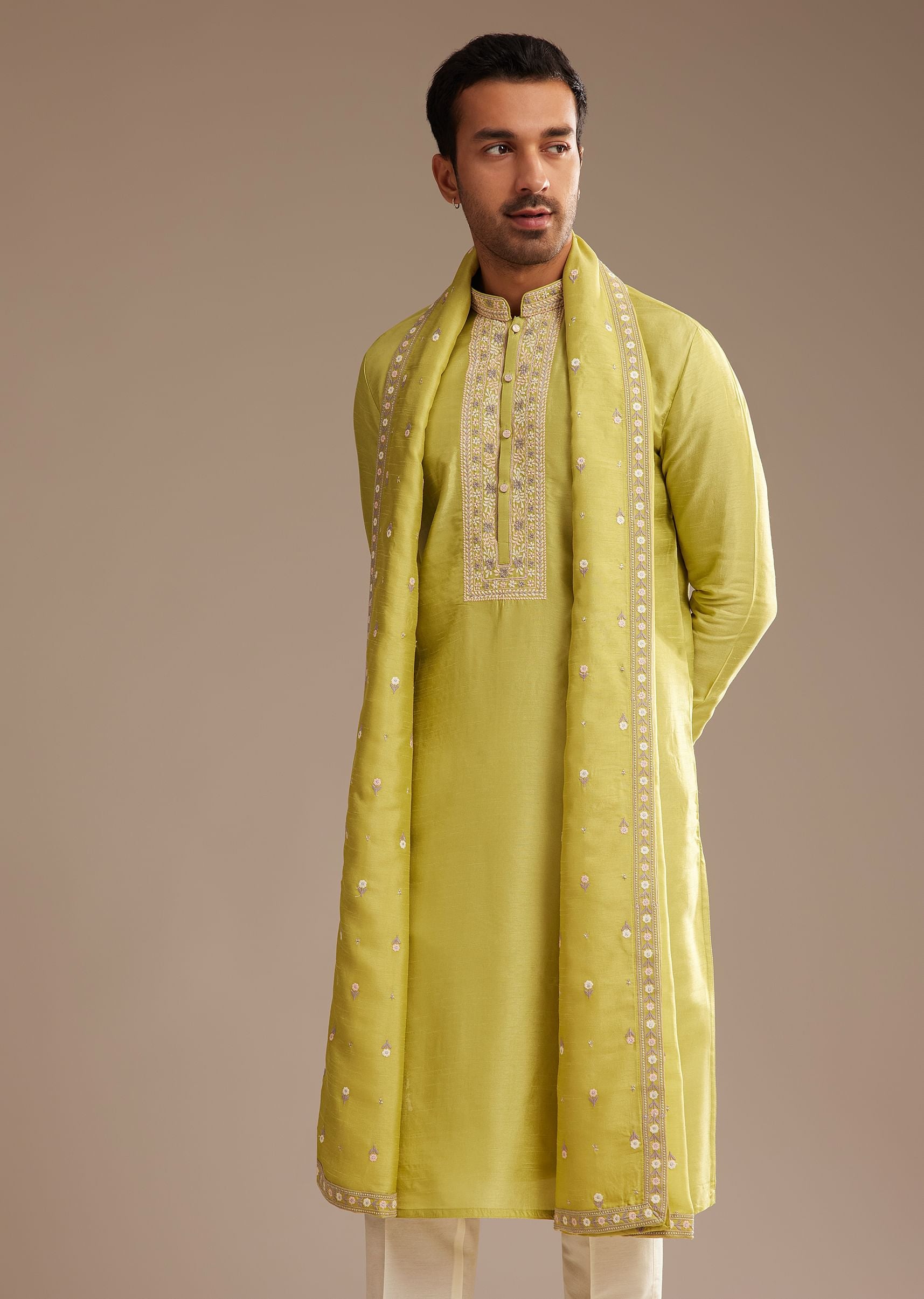 Embrace vibrant elegance with this yellow silk kurta set, beautifully adorned with intricate embroidery on the placket. The delicate threadwork enhances the luxurious sheen of the silk fabric, adding a... More Product Details