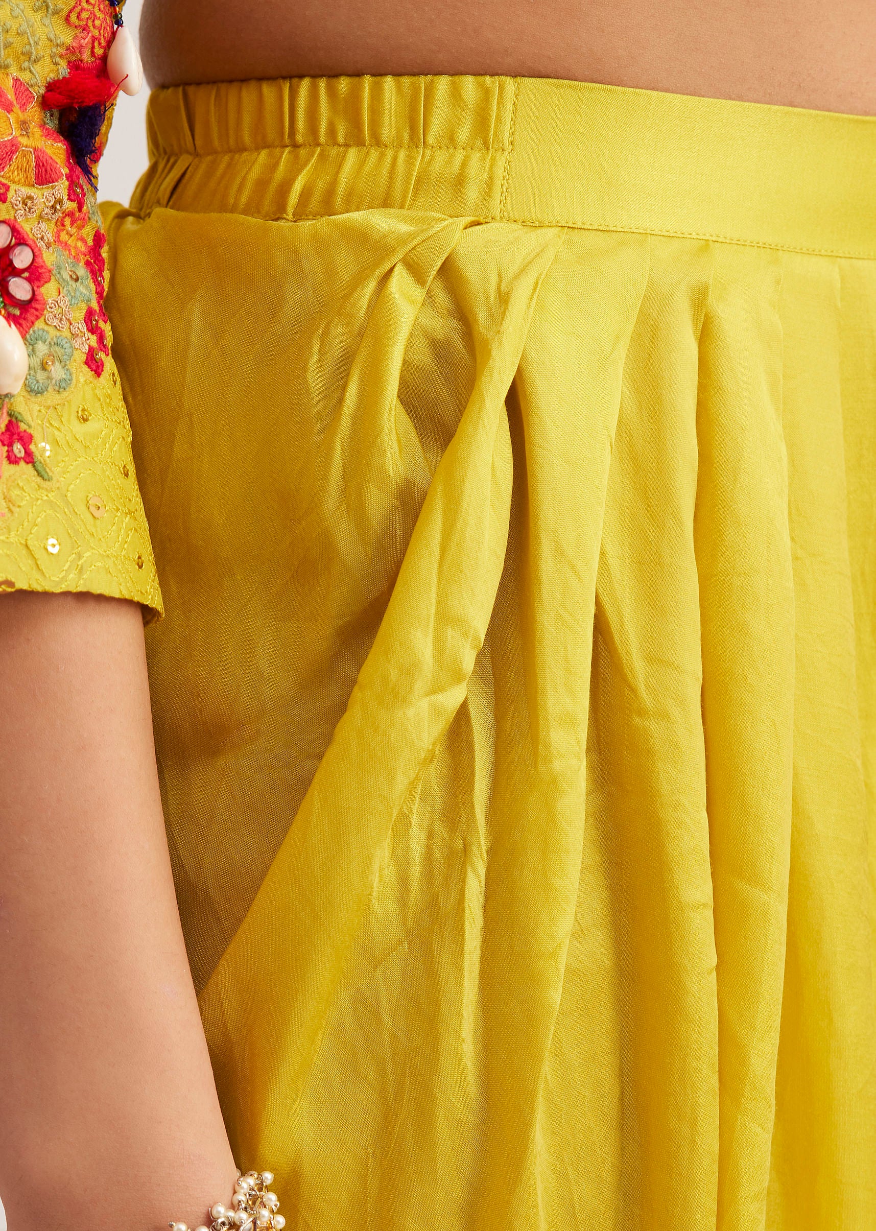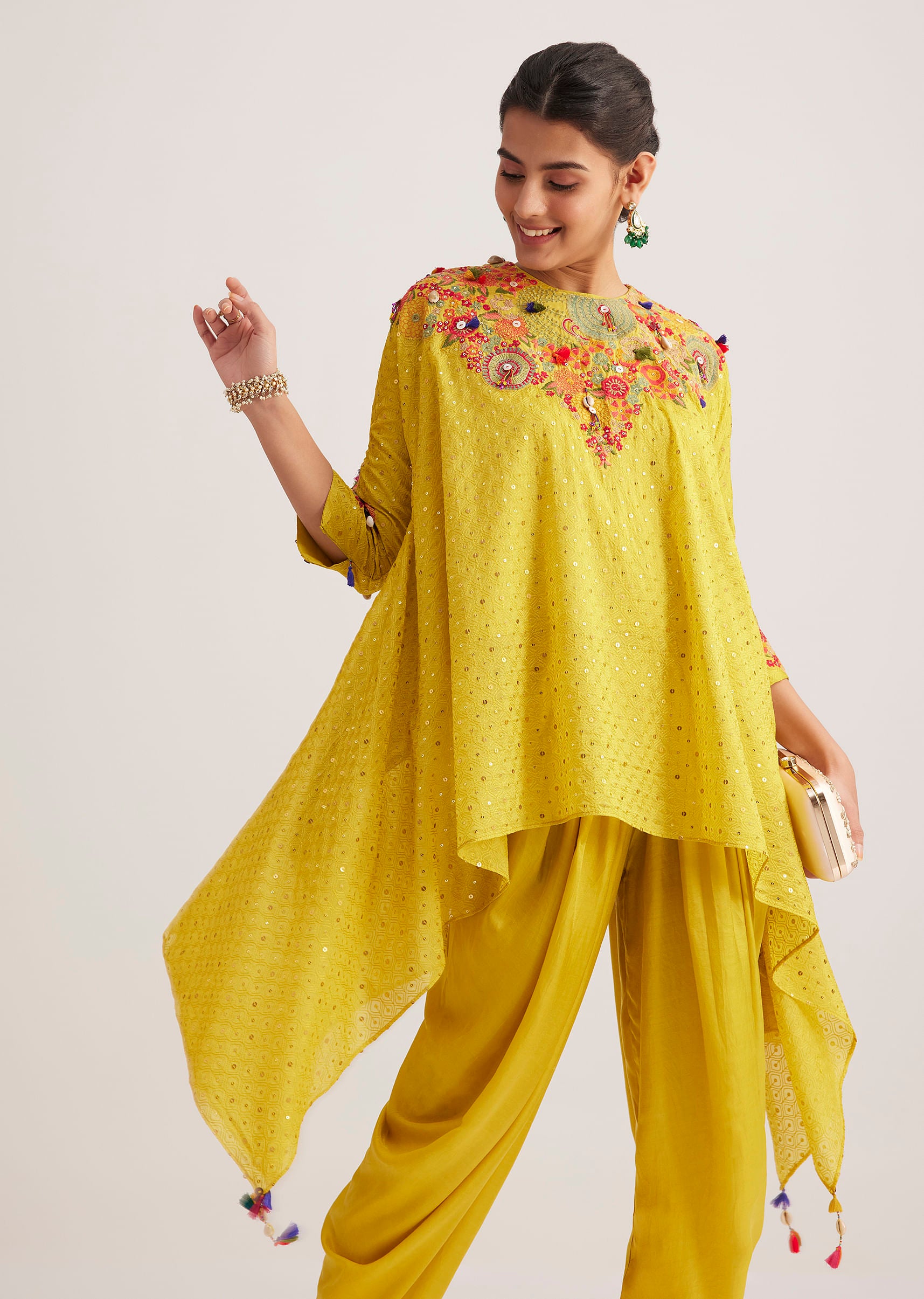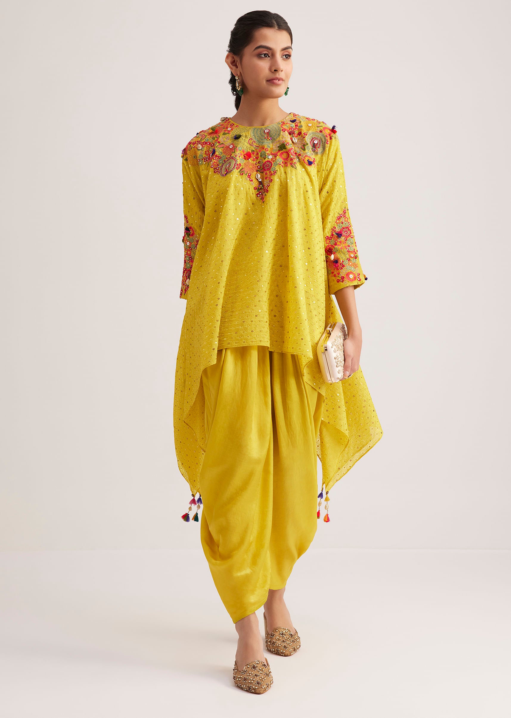 Yellow Silk Kurta Dhoti Set With Resham Embroidery And Tassel Details