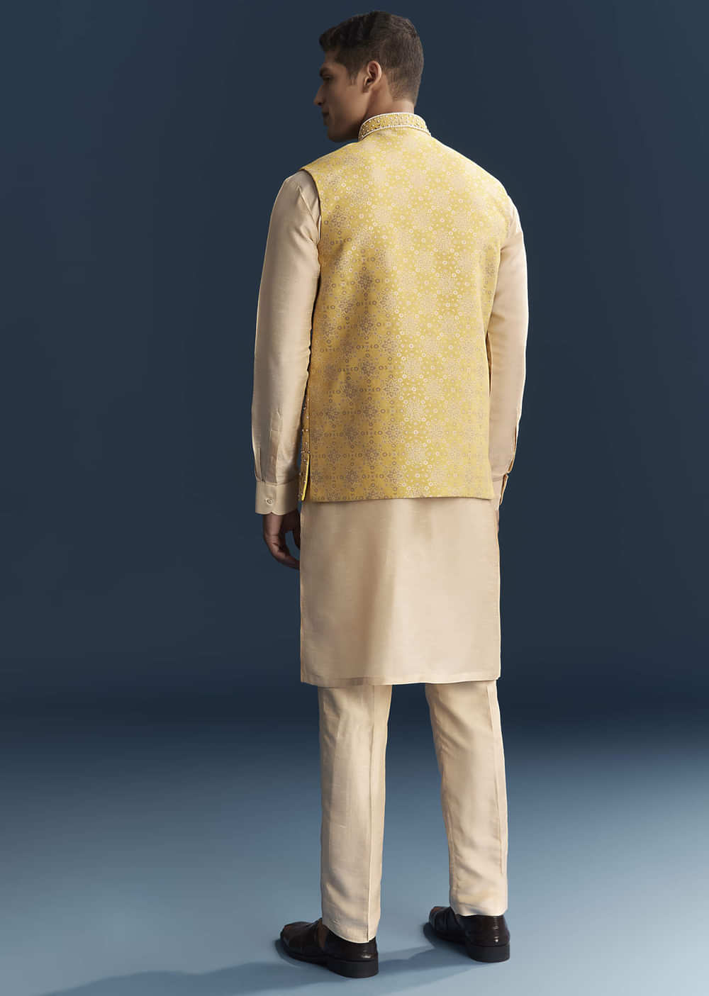 Sunlit and celebratory, this jacquard silk men's kurta jacket set has a cream kurta with yellow embroidered vest that stands out at day functions. Heavy hand embroidery blends cutdana, moti,... More Product Details