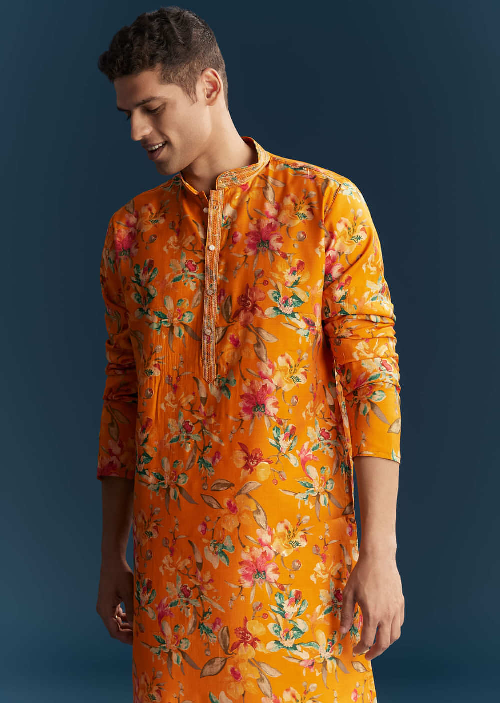 Yellow Silk Kurta Set For Men With Multicolour Floral Print