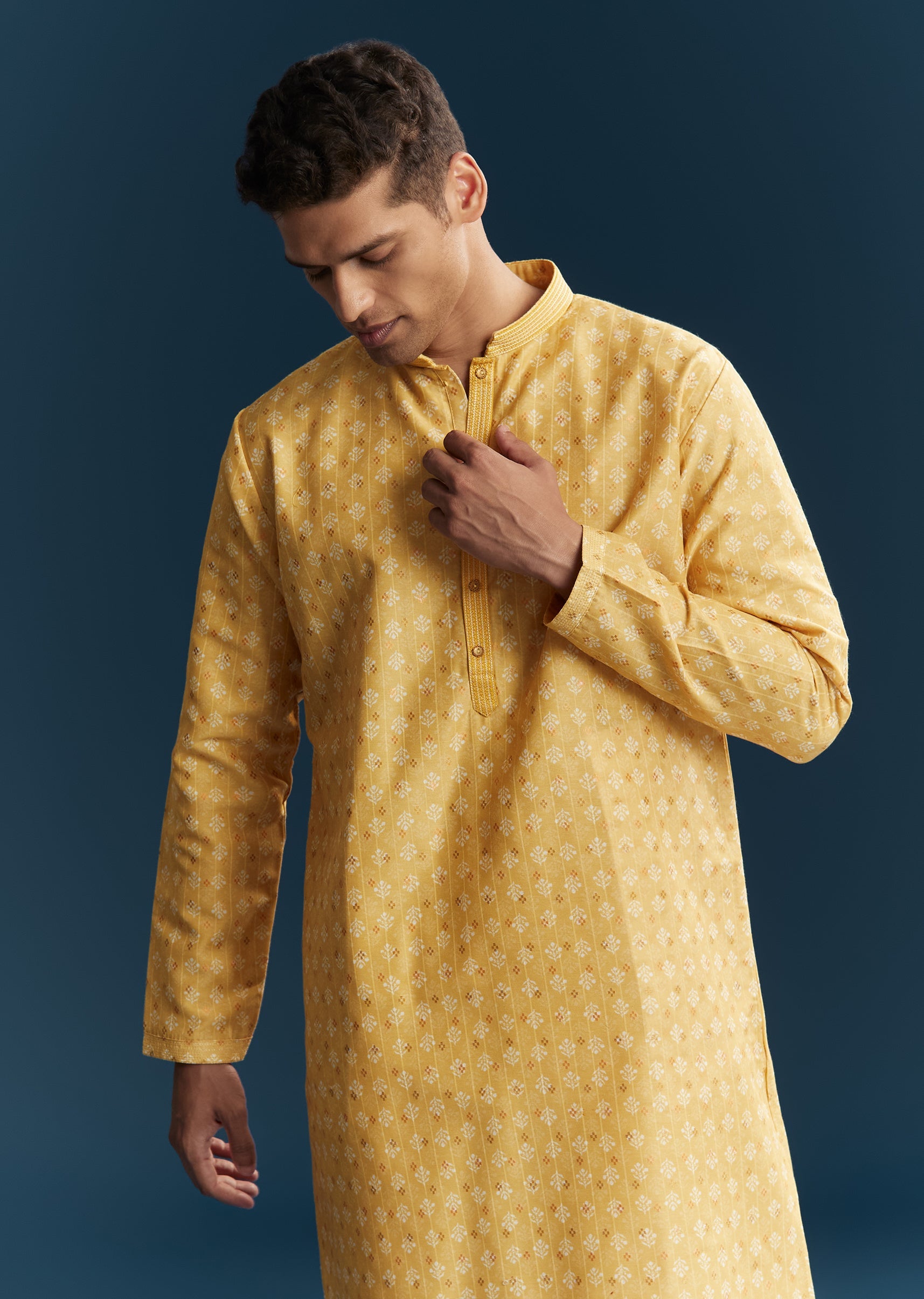 Bright and subtle, this yellow men’s kurta set in soft pastels is perfect for casual festive occasions. Crafted in smooth silk fabric, it features minimal thread detailing that adds texture... More Product Details