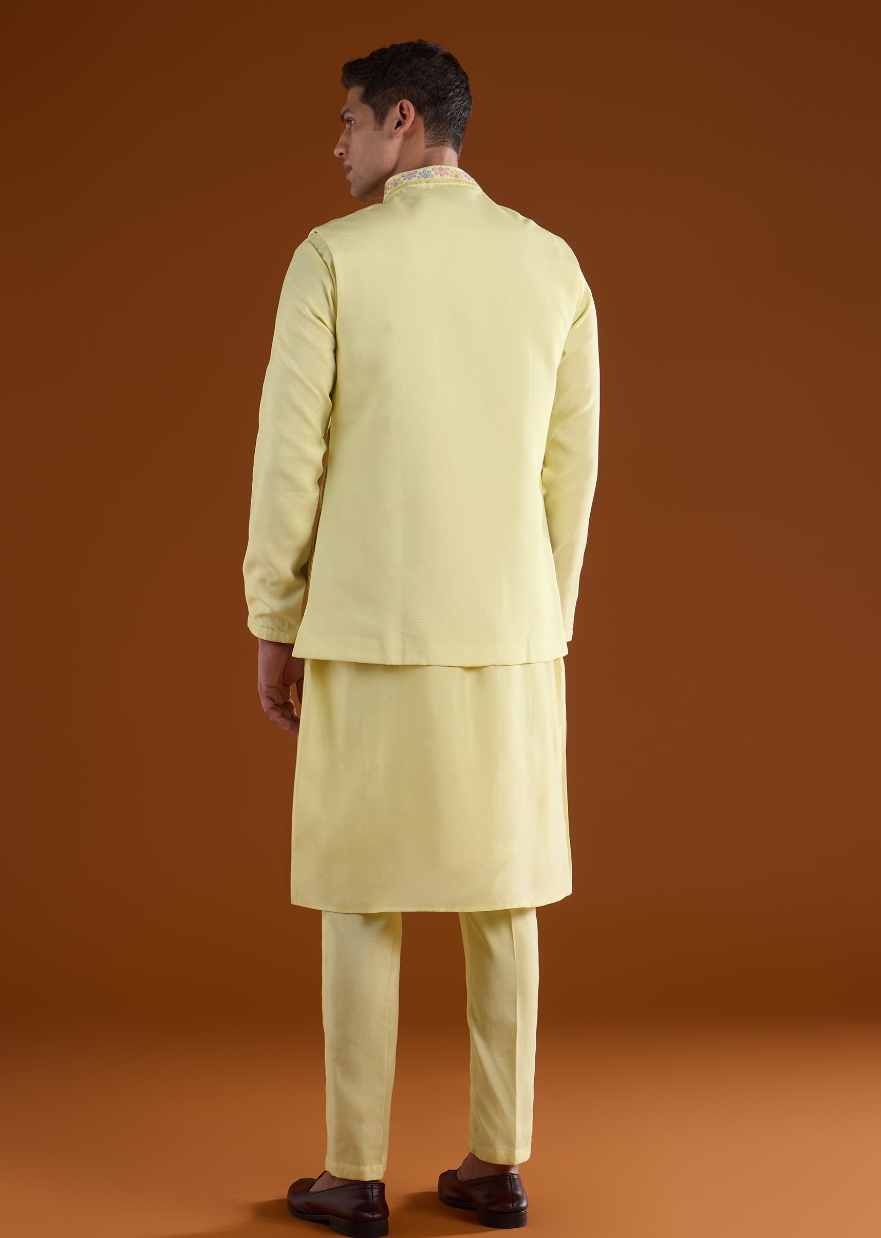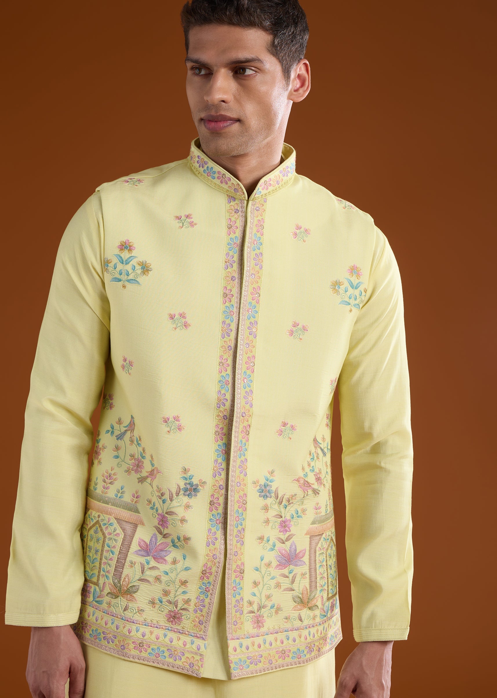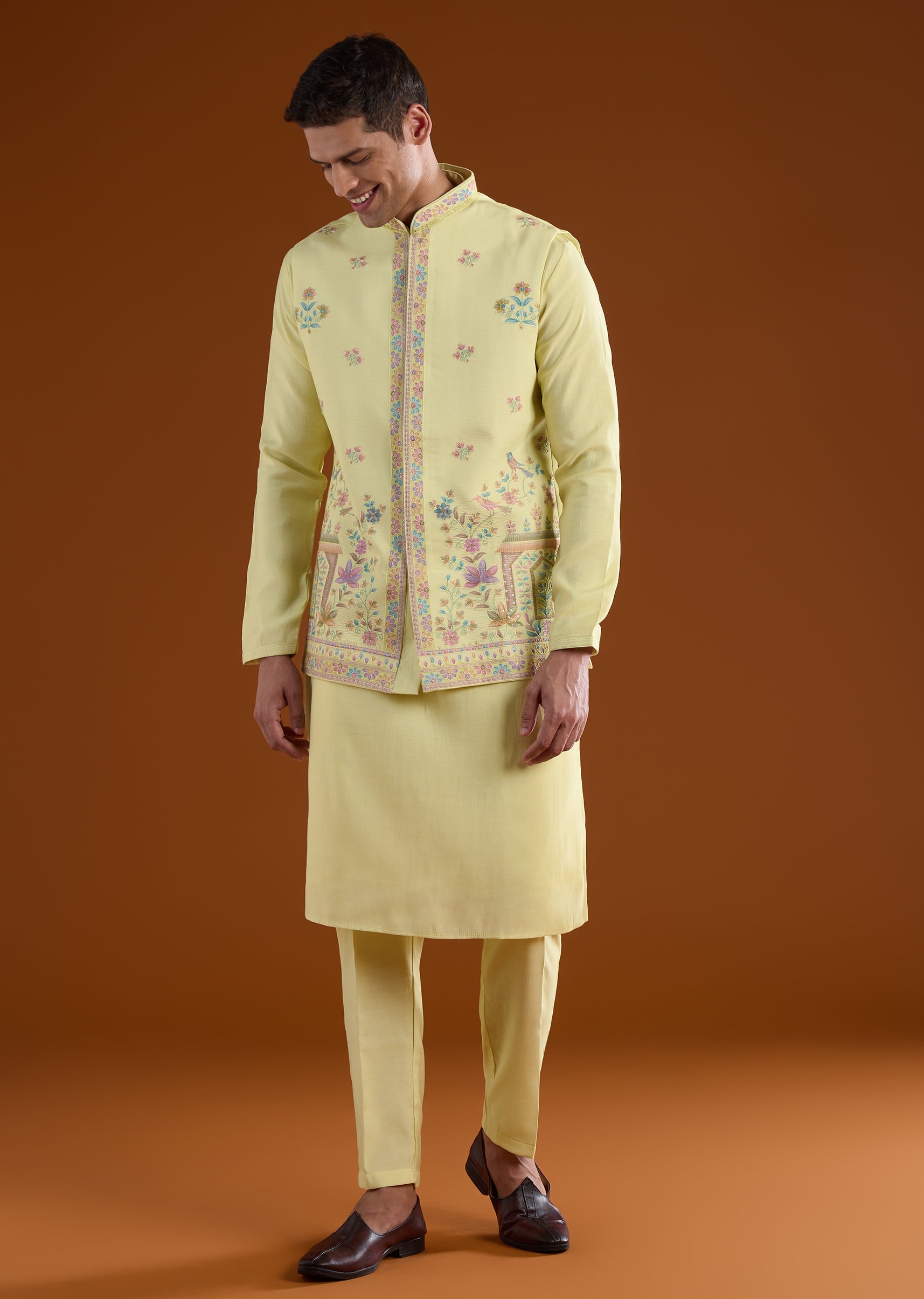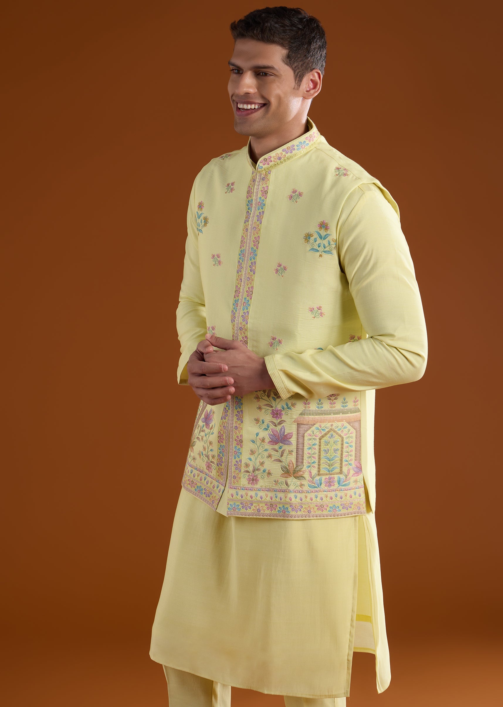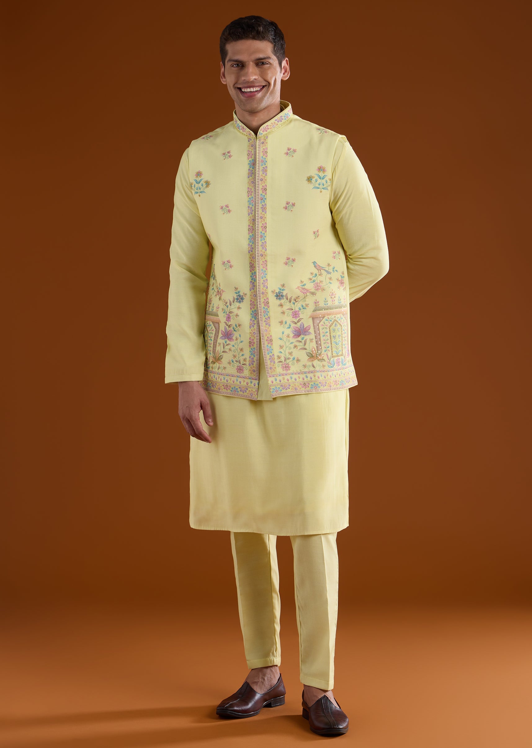 Yellow Silk Mens Kurta Jacket Set With Thread And Motif Work