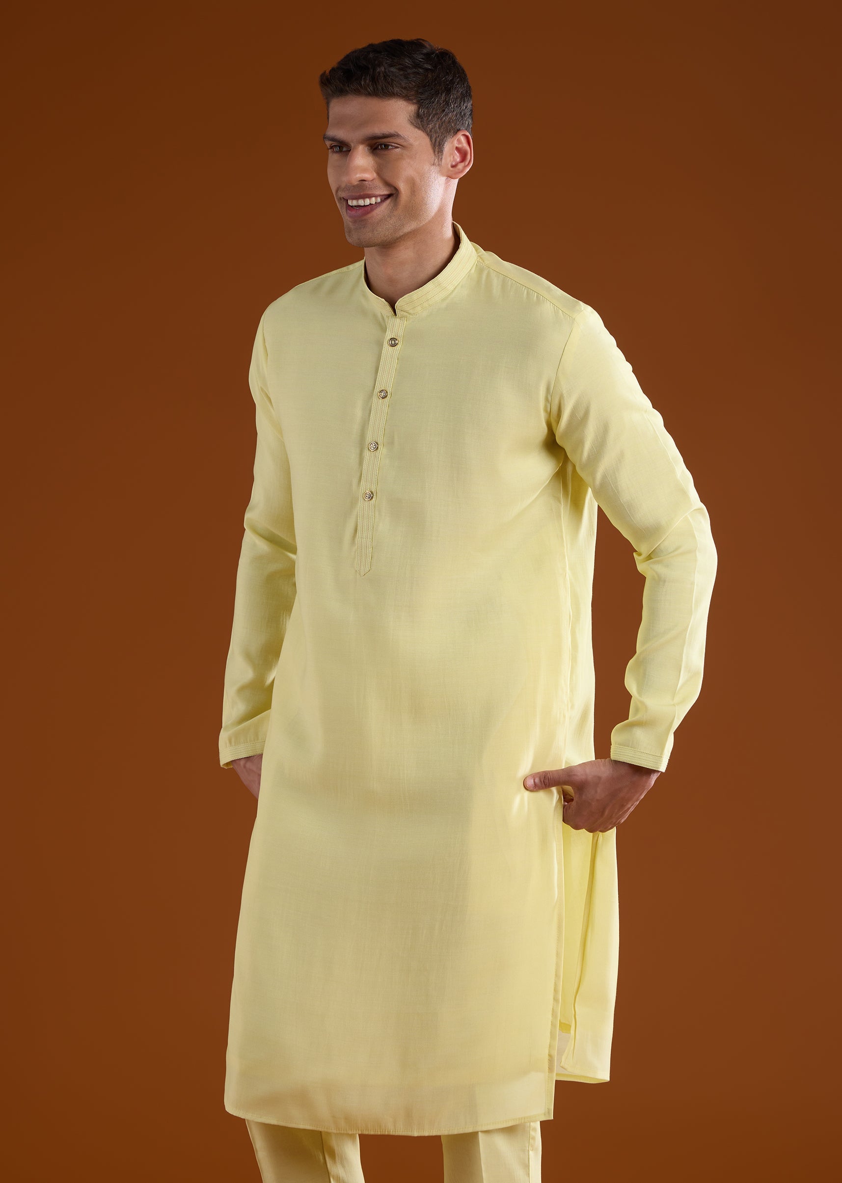 A vibrant yellow silk kurta jacket set crafted for festive pooja, haldi, and mehendi celebrations, perfect for wedding guests. Detailed with delicate thread and motif work, it brings cheerful elegance while maintaining a structured silhouette. The full sleeves and mandarin collar complete a polished and refined traditional look. Awarded as the Most Trusted Brand, we're delivering styles you love, just as promised.