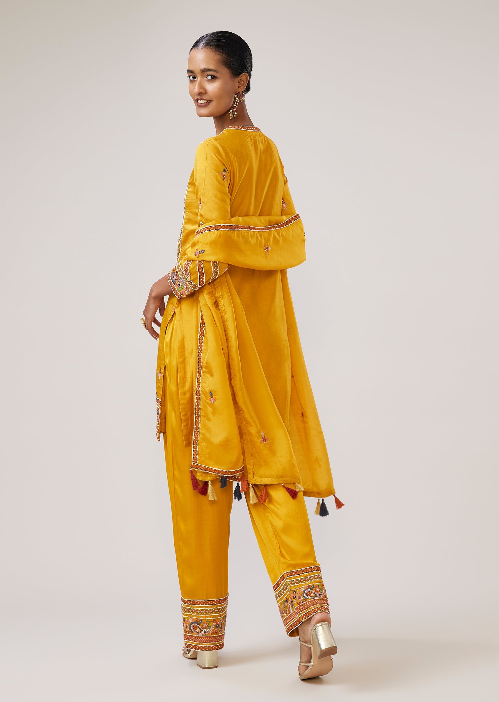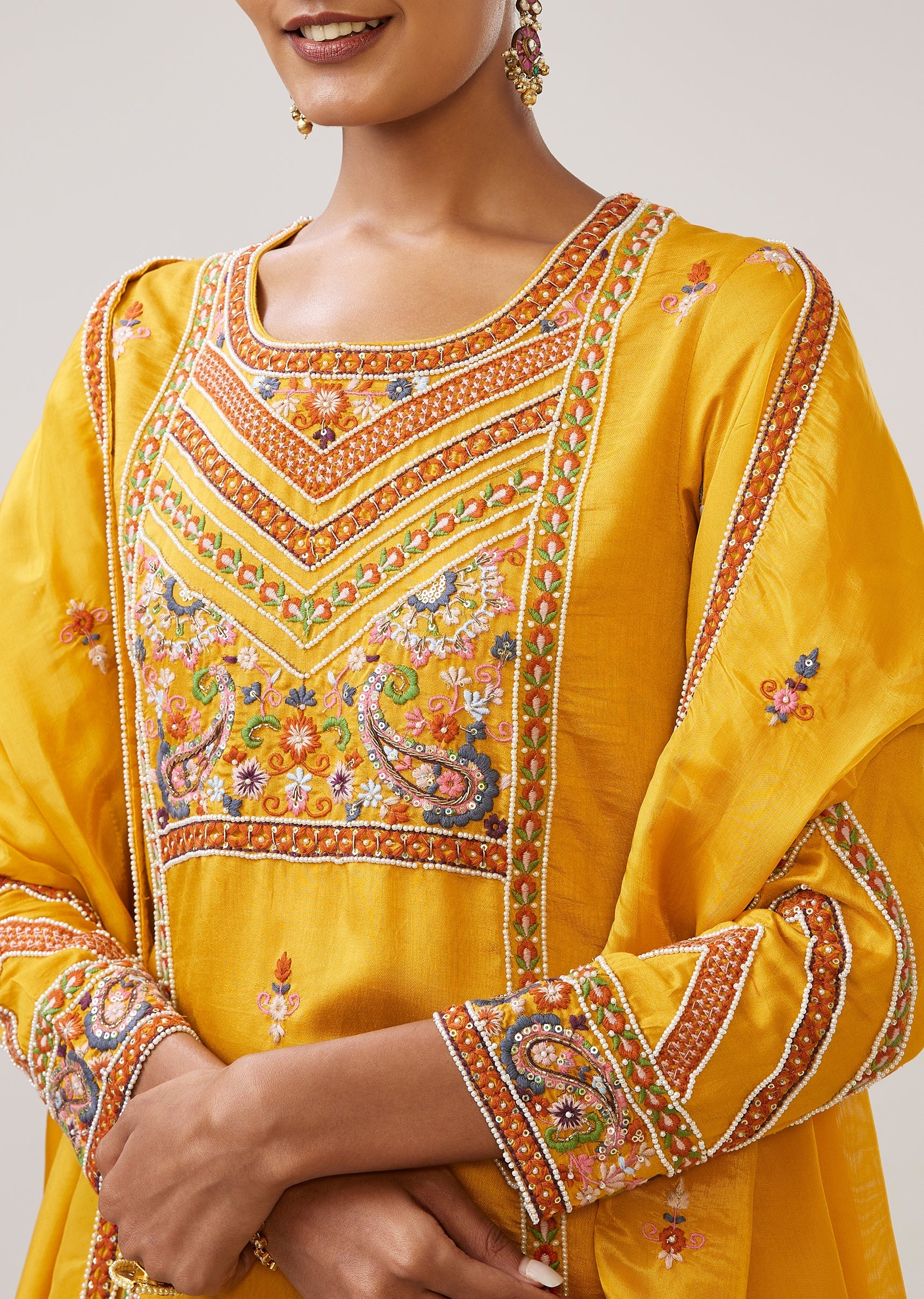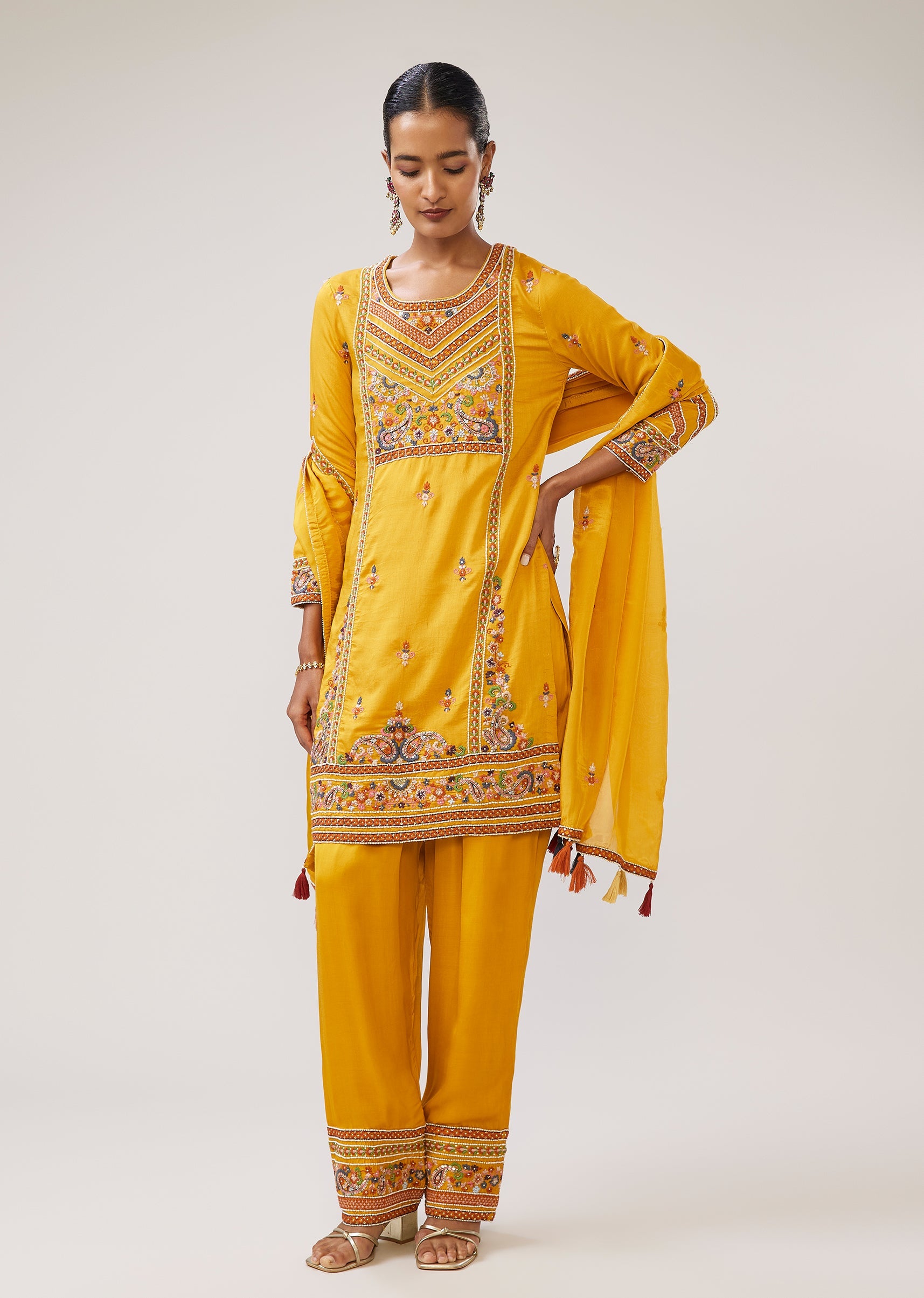 Yellow Thread And Moti Work Kurti Pant Set With Dupatta