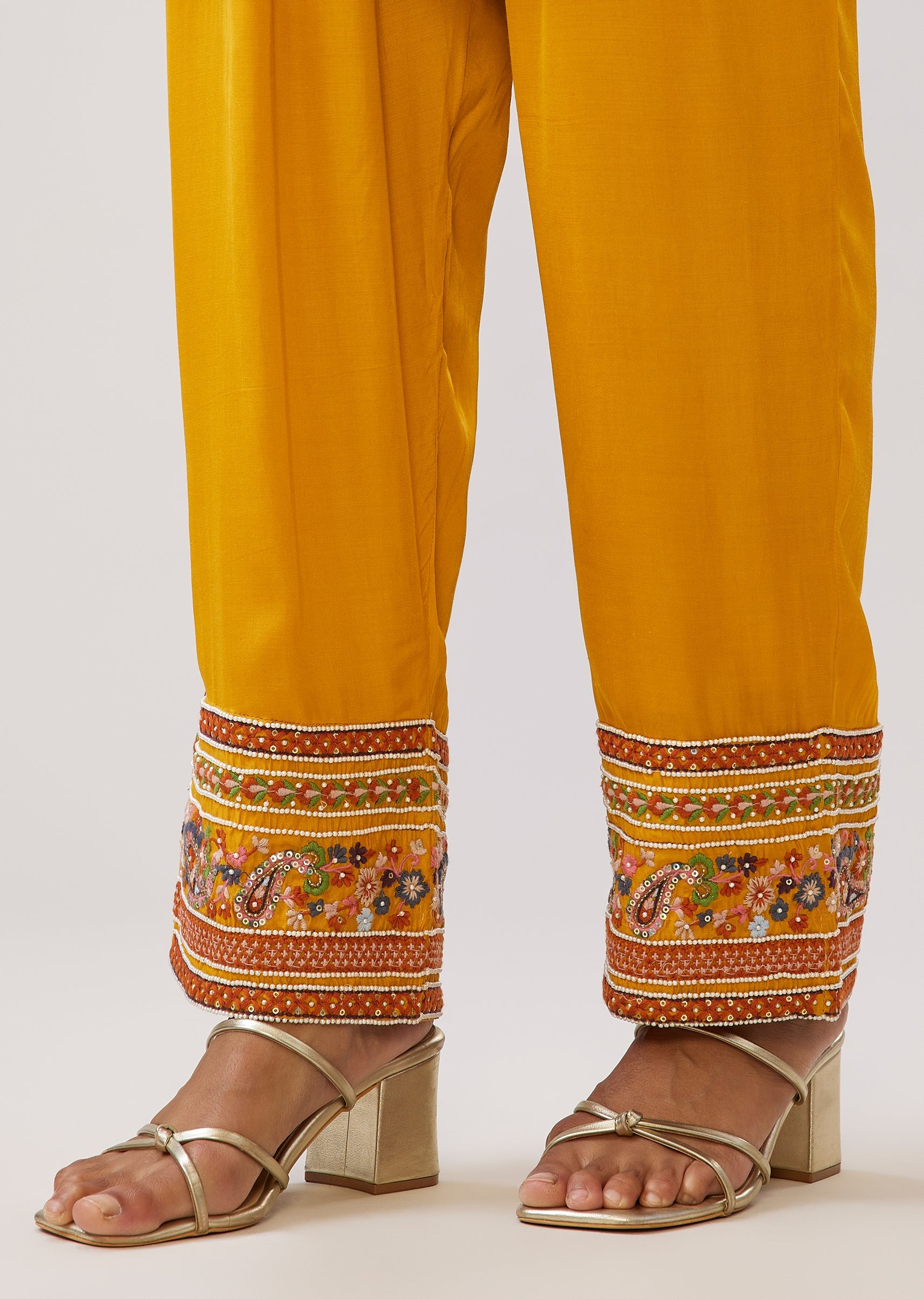Perfect for haldi and festive celebrations, this yellow silk kurti pant set features elegant thread and moti work for a refined finish. The straight kurta with 3/4th sleeves and round... More Product Details