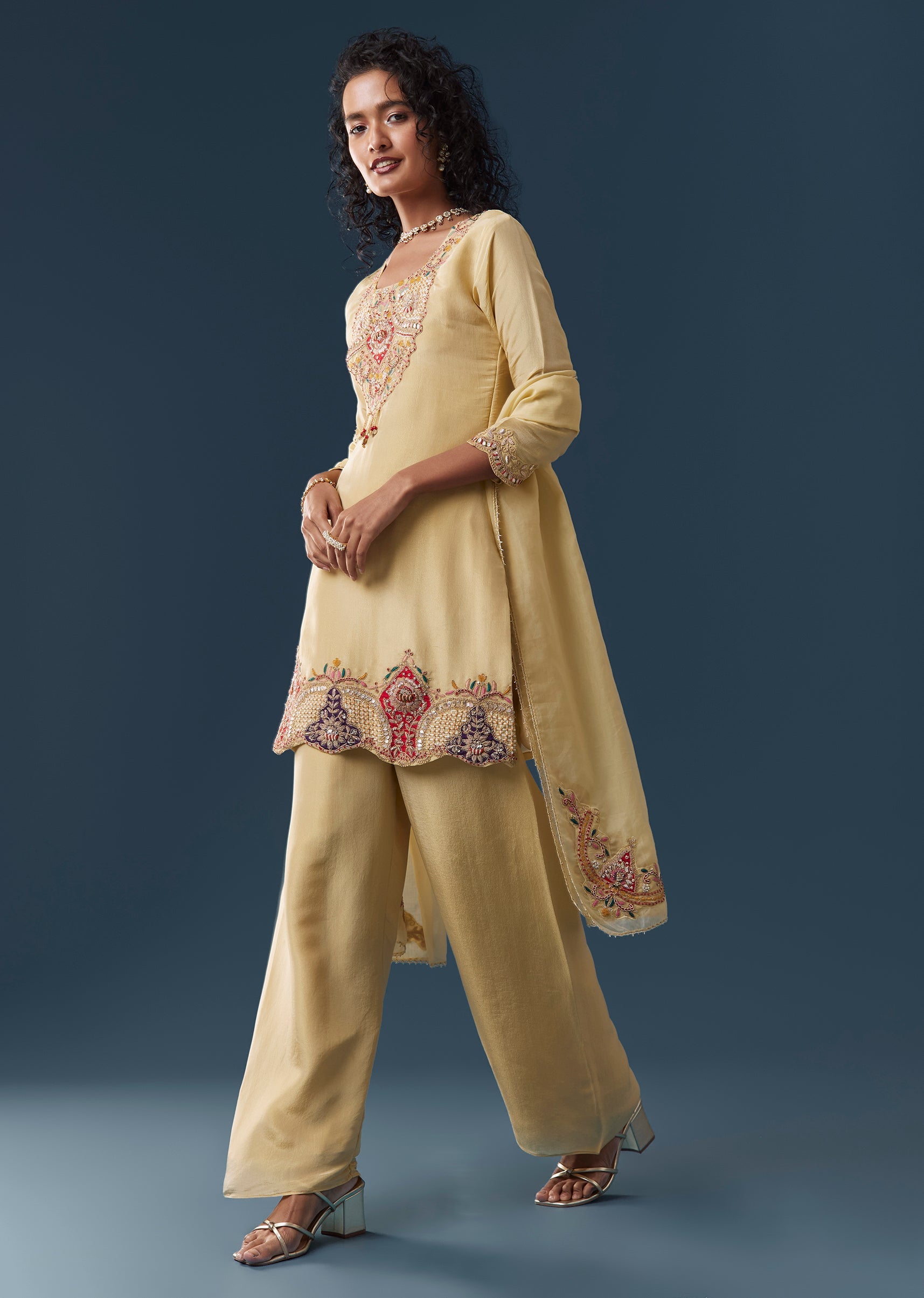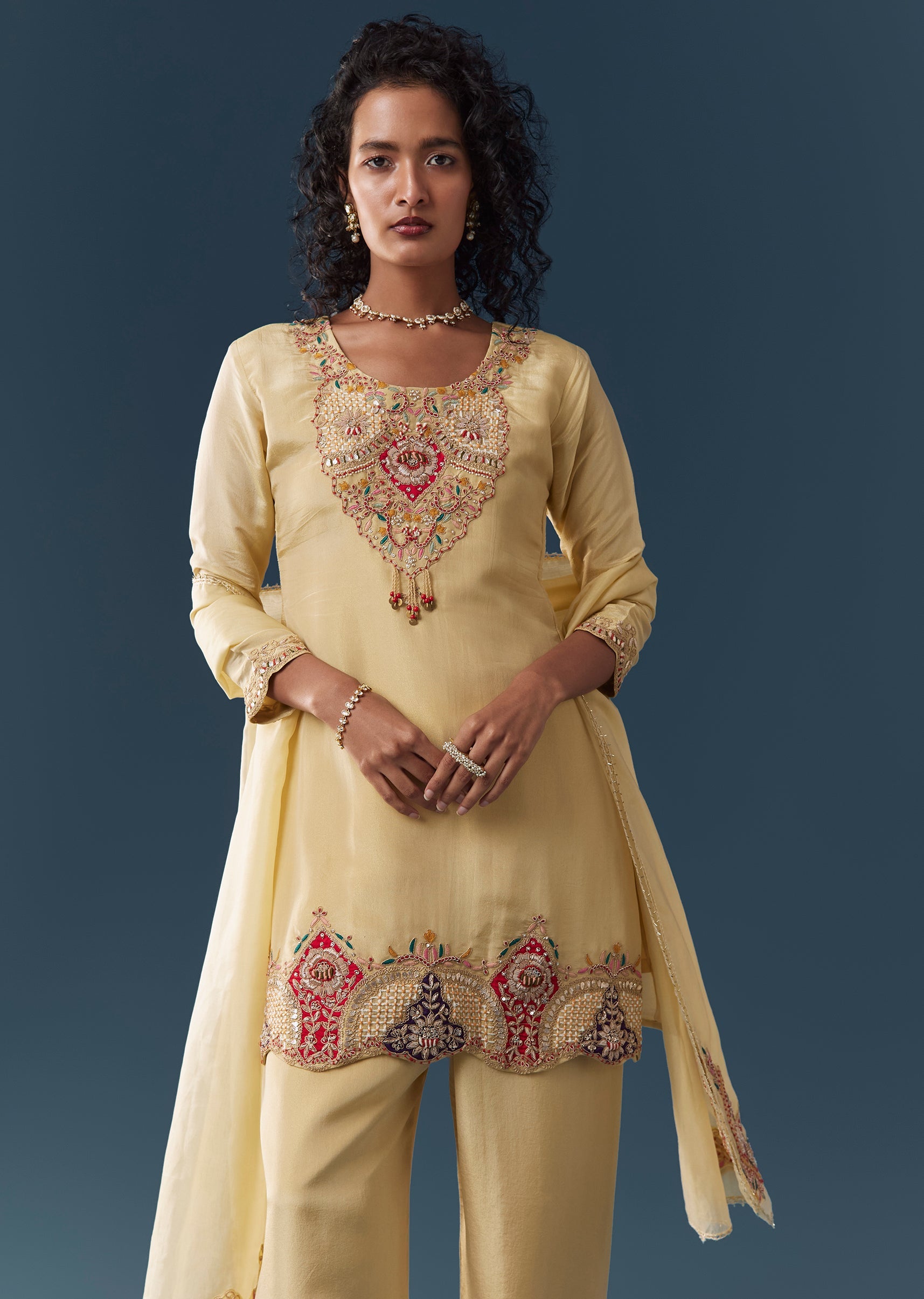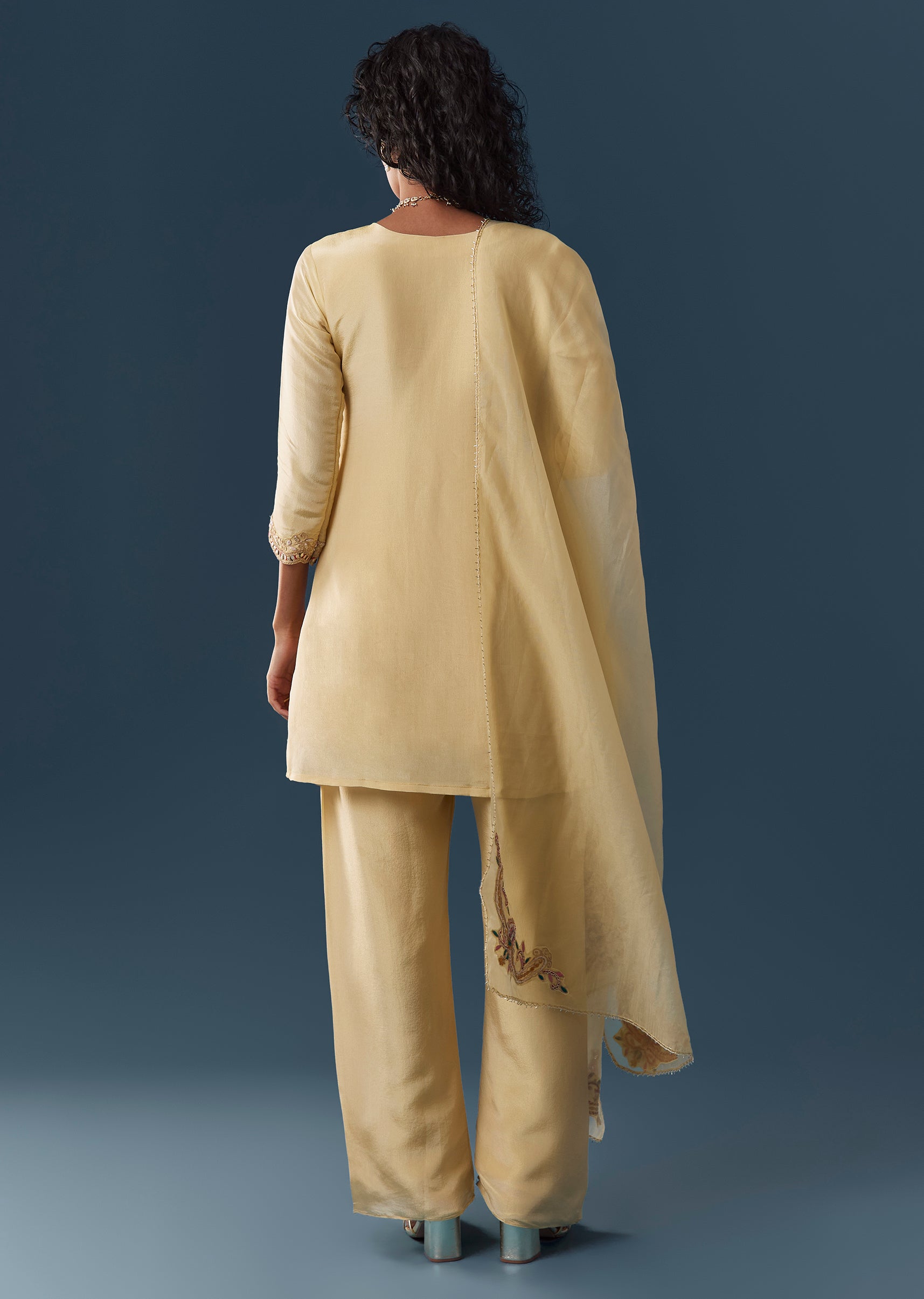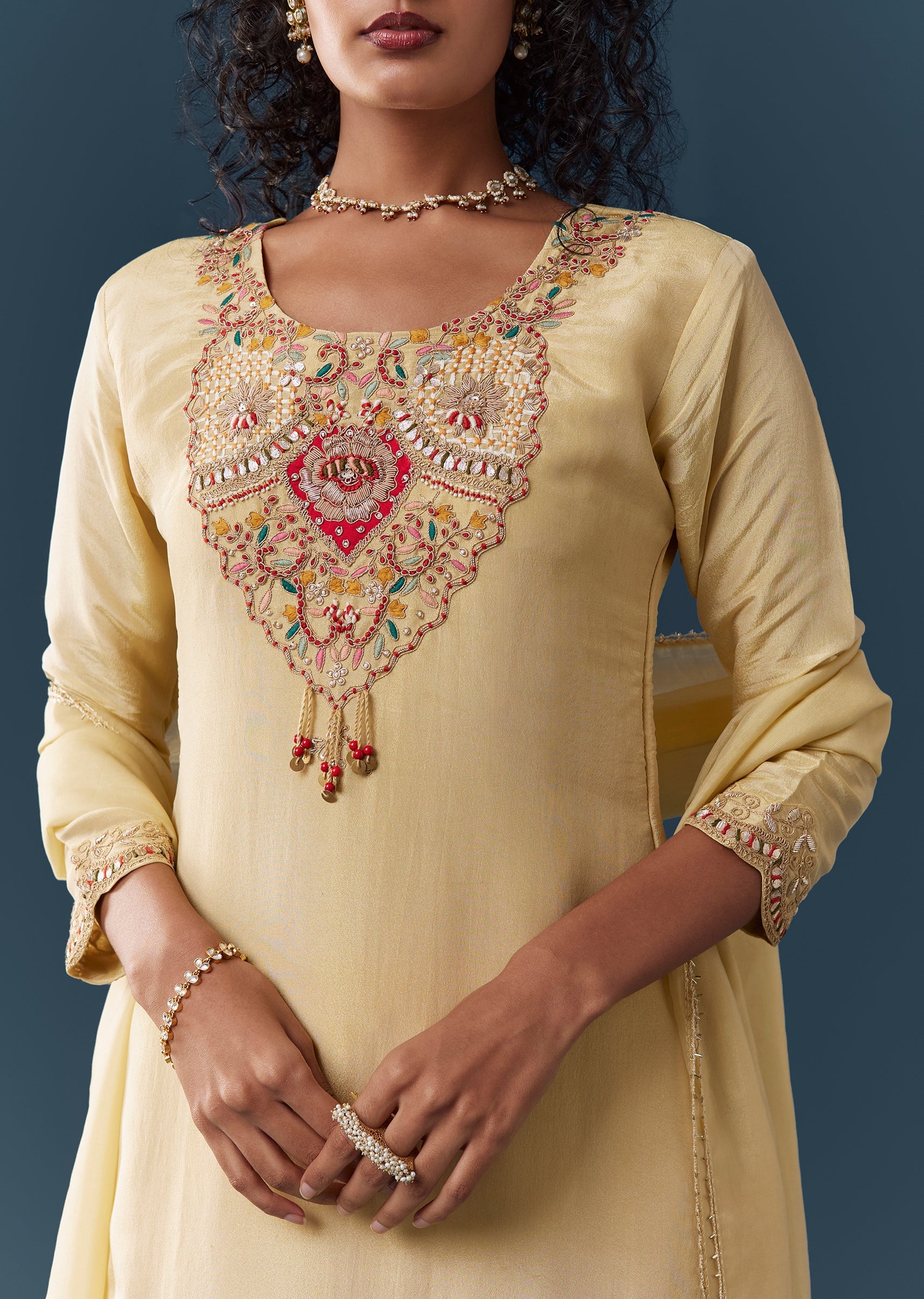 This festive yellow tissue set features a straight kurta enhanced with zardosi and thread embroidery along with patch-work detailing. Designed with a round neckline and 3/4th sleeves, it comes with... More Product Details