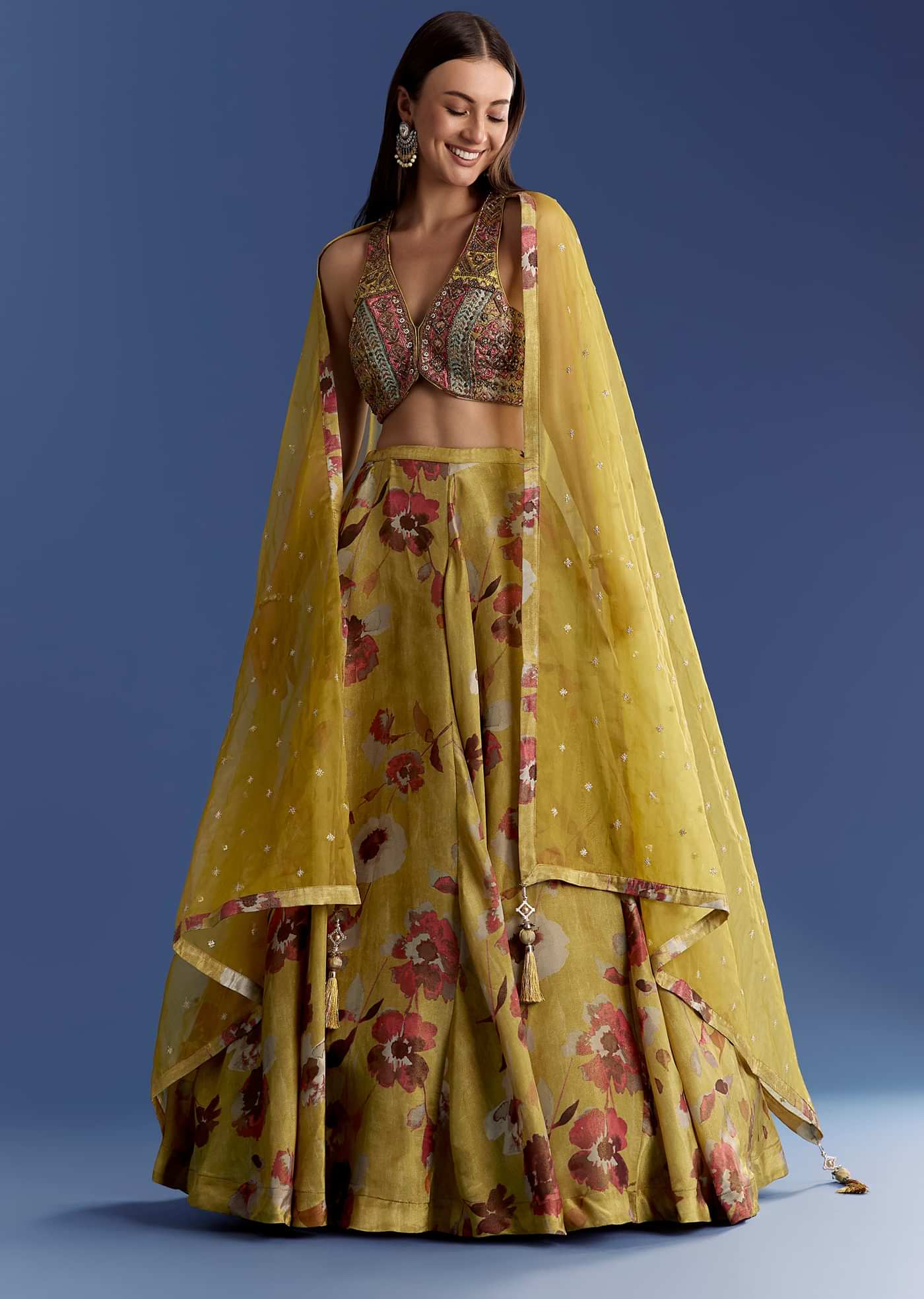 This sunshine-yellow tissue lehenga blooms with floral print and is paired with a zardosi choli and a sequins butti organza dupatta. A haldi-sangeet treasure for the spotlight-stealer. Standard length for... More Product Details
