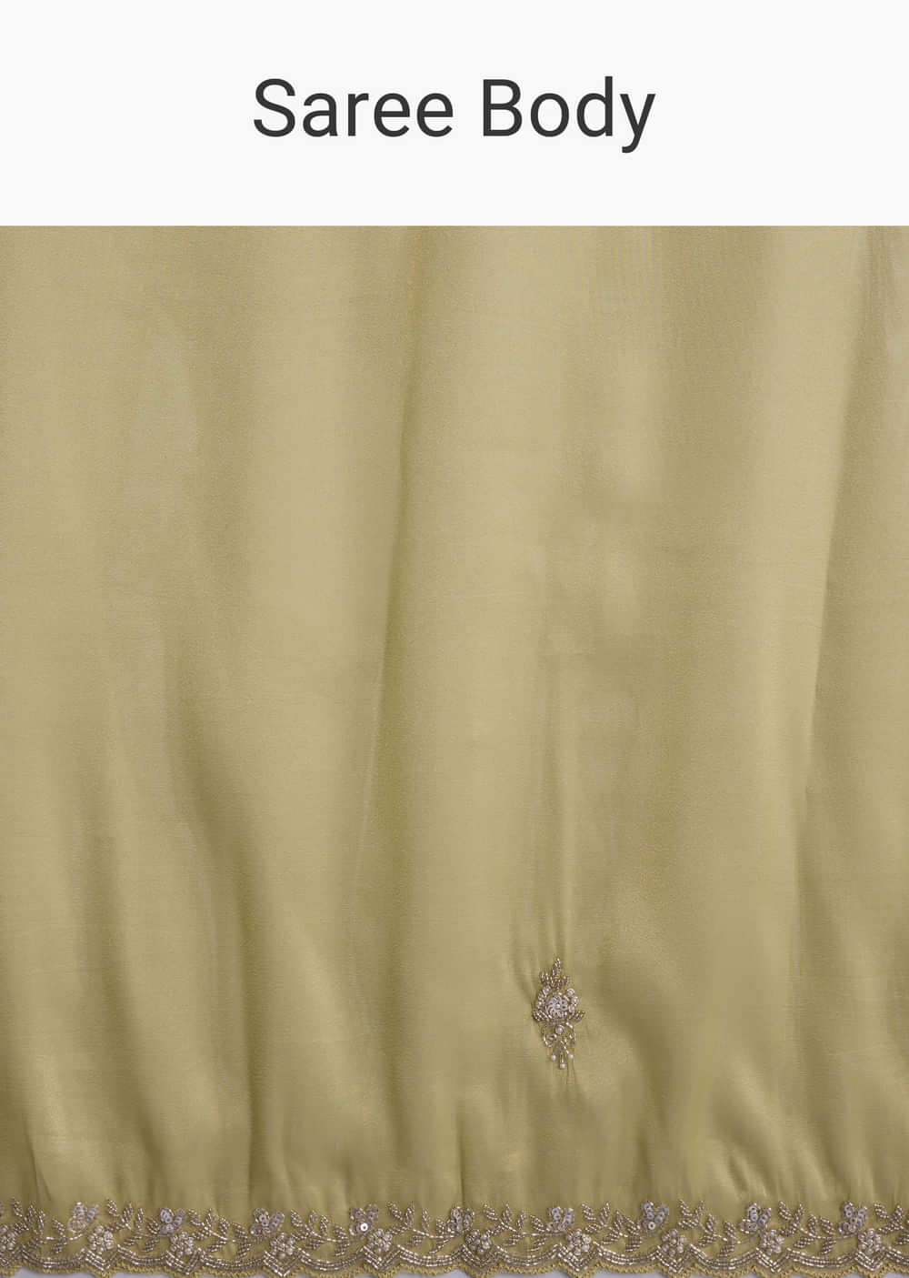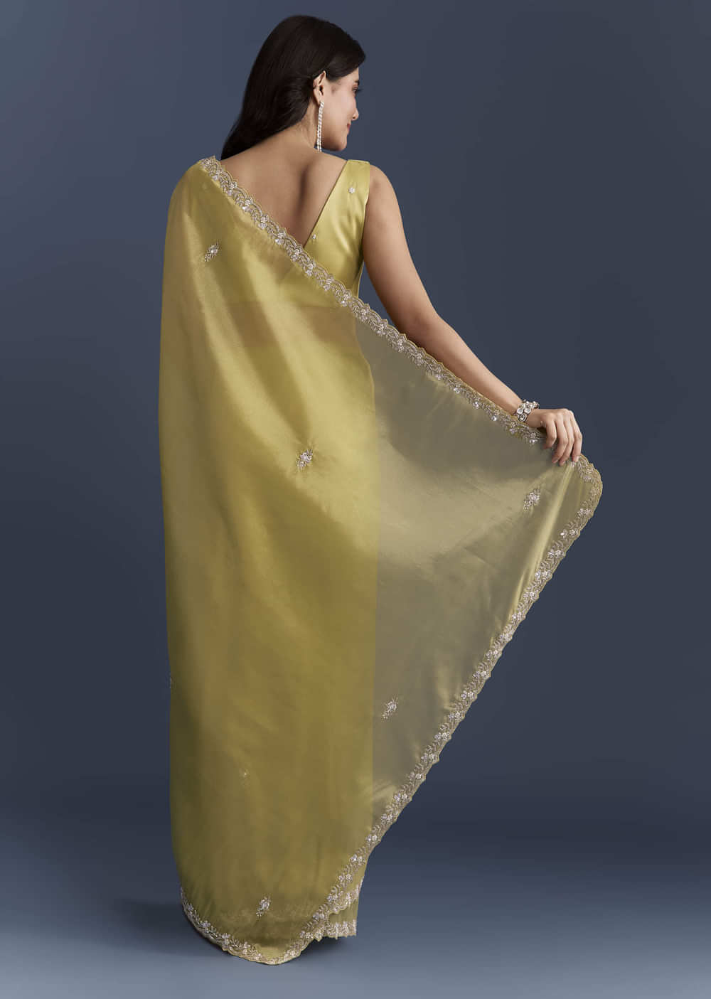 Sunny and celebratory, this yellow tissue saree is scattered with butti and finished with a cutwork border embroidered in cutdana, sequins and beads. The tissue sheen keeps it bright without... More Product Details