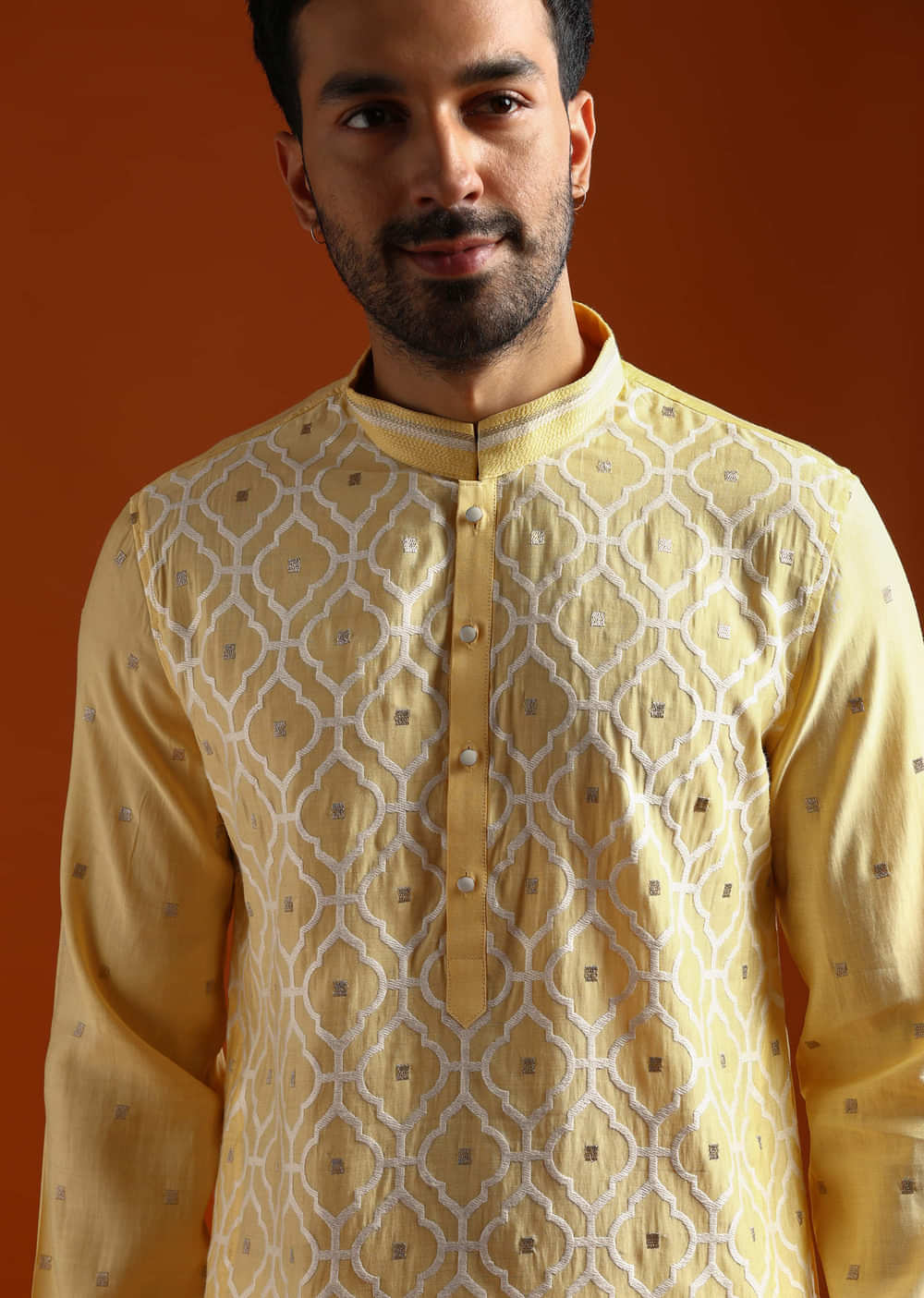 Sunny and celebratory, this yellow viscose men’s kurta set places slim resham accents where they catch the light. The fabric moves well, keeping the colour lively in photos and on... More Product Details