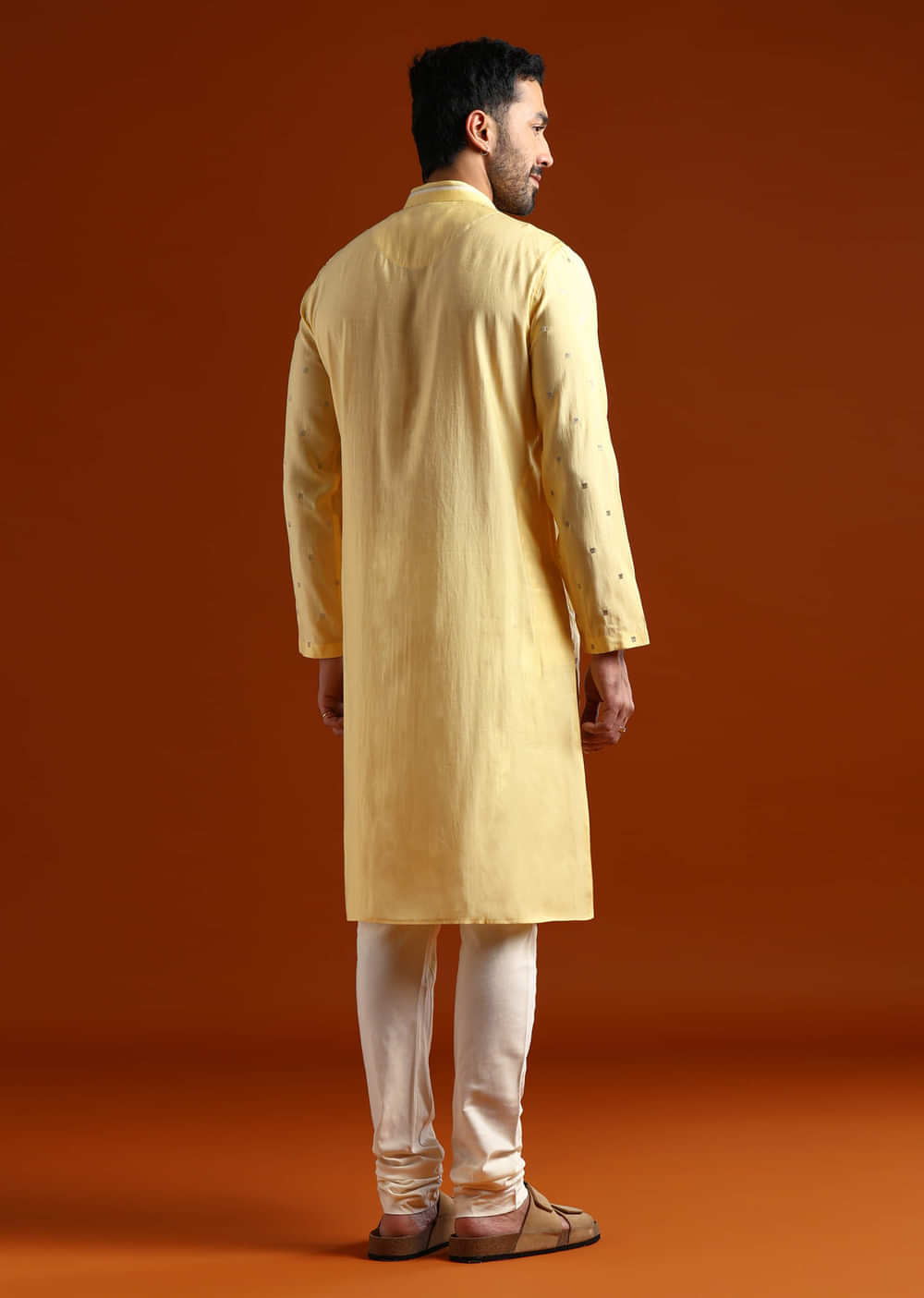 Opt for off-white mojaris and keep grooming neat for a crisp finish.