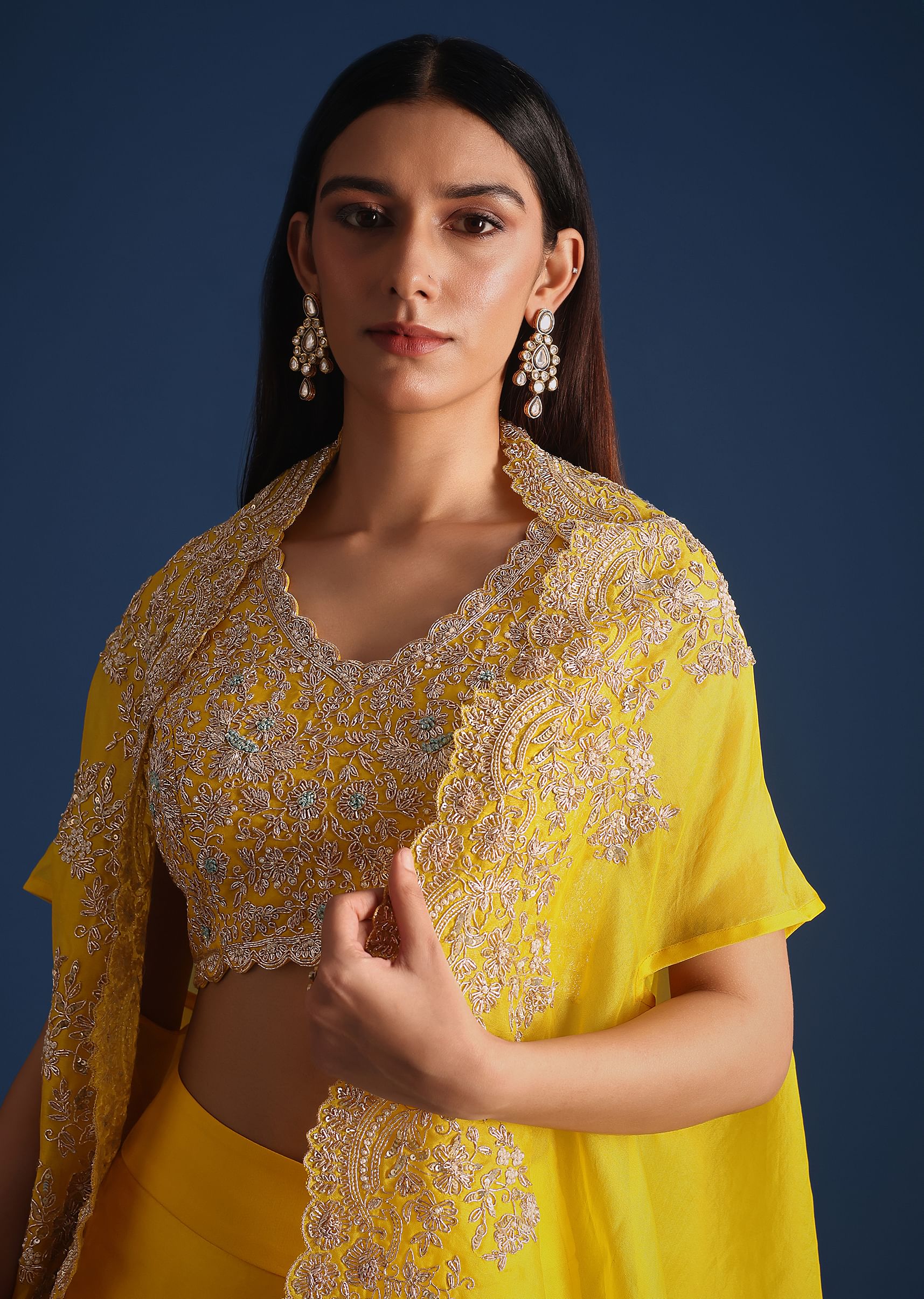 Yellow Zardozi Work Crop Top With Jacket And Skirt